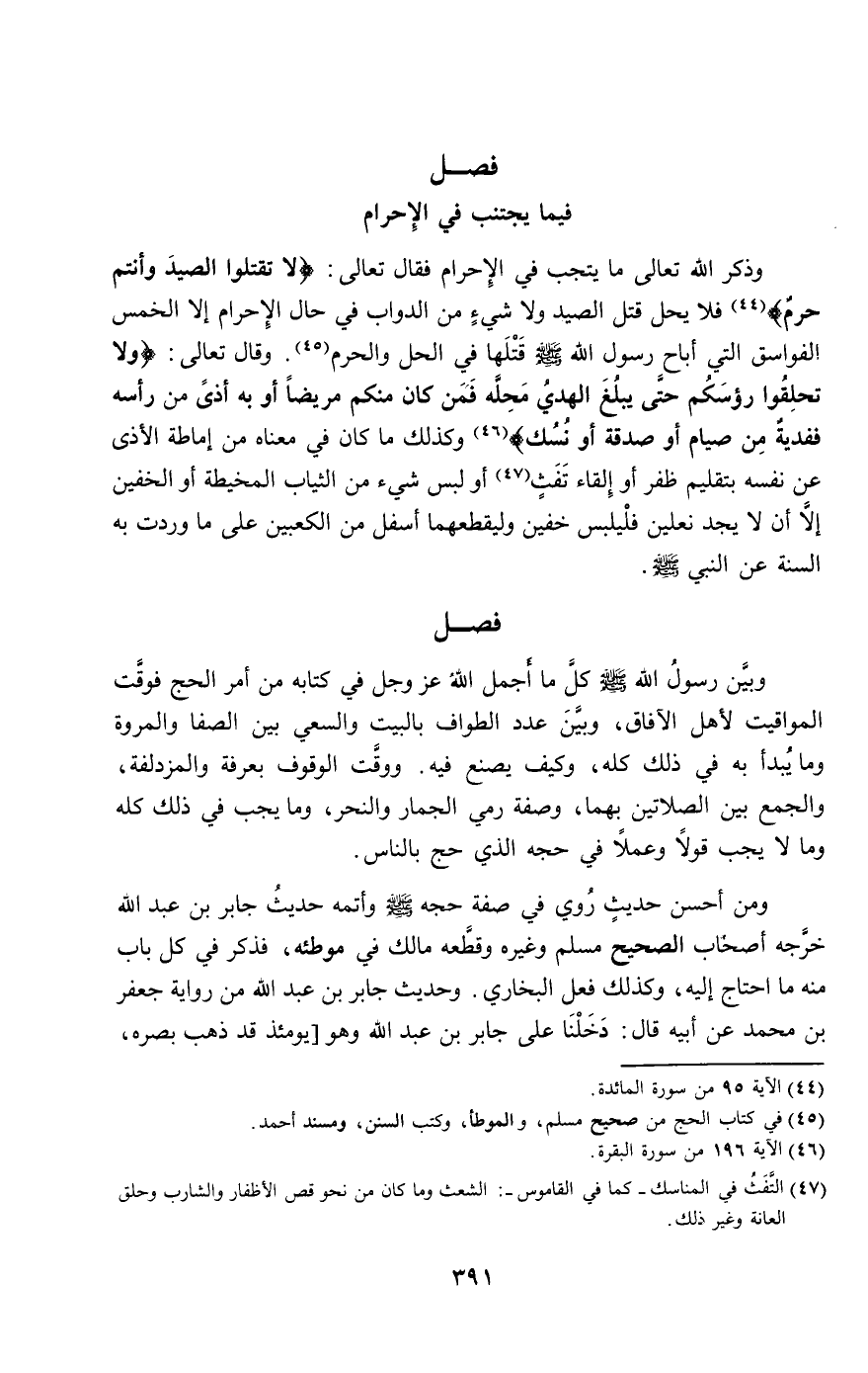 وذكر الله تعالى ما يجتنب في الإحرام فقال تعالى: {لا تَقْتُلُوا الصَّيْدَ وَأَنْتُمْ حُرُمٌ} [المائدة: 95] فلا يحل قتل الصيد ولا شيء من الدواب في حال الإحرام إلا الخمس الفواسق التي أباح رسول الله - صَلَّى اللَّهُ عَلَيْهِ وَسَلَّمَ - قتلها في الحل والحرم. وقال تعالى: {وَلا تَحْلِقُوا رُءُوسَكُمْ حَتَّى يَبْلُغَ الْهَدْيُ مَحِلَّهُ فَمَنْ كَانَ مِنْكُمْ مَرِيضًا أَوْ بِهِ أَذًى مِنْ رَأْسِهِ فَفِدْيَةٌ مِنْ صِيَامٍ أَوْ صَدَقَةٍ أَوْ نُسُكٍ} [البقرة: 196] وكذلك ما كان في معناه من إماطة الأذى عن نفسه بتقليم ظفر أو إلقاء تفث أو لبس شيء من الثياب المخيطة أو الخفين إلا أن لا يجد نعلين فليلبس خفين وليقطعهما أسفل من الكعبين على ما وردت به السنة عن النبي - صَلَّى اللَّهُ عَلَيْهِ وَسَلَّمَ -.