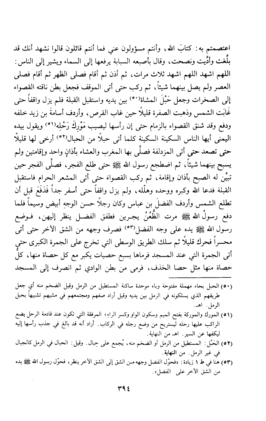 اعتصمتم به: كتاب الله، وأنتم مسؤولون عني فما أنتم قائلون، قالوا: نشهد أنك قد بلغت وأديت ونصحت، وقال بأصبعه السبابة يرفعها إلى السماء ويشير إلى الناس: اللهم اشهد، اللهم اشهد ثلاث مرات، ثم أذن ثم أقام فصلى الظهر ثم أقام فصلى العصر ولم يصل بينهما شيئا، ثم ركب حتى أتى الموقف فجعل بطن ناقته القصواء إلى الصخرات وجعل حبل المشاة بين يديه واستقبل القبلة فلم يزل واقفا حتى غابت الشمس وذهبت الصفرة قليلا حين غاب القرص، وأردف أسامة بن زيد خلفه ودفع وقد شنق القصواء بالزمام حتى إن رأسها ليصيب مورك رحله ويقول بيده اليمنى: أيها الناس السكينة السكينة كلما أتى حبلا من الحبال أرخى لها قليلا حتى تصعد حتى أتى المزدلفة فصلى بها المغرب والعشاء بأذان واحد وإقامتين ولم يسبح بينهما شيئا، ثم اضطجع رسول الله - صَلَّى اللَّهُ عَلَيْهِ وَسَلَّمَ - حتى طلع الفجر، فصلى الفجر حين تبين له الصبح بأذان وإقامة، ثم ركب القصواء حتى أتى المشعر الحرام فاستقبل القبلة فدعا الله وكبره ووحده وهلله، ولم يزل واقفا حتى أسفر جدا فدفع قبل أن تطلع الشمس وأردف الفضل بن عباس وكان رجلا حسن الوجه أبيض وسيما فلما دفع رسول الله - صَلَّى اللَّهُ عَلَيْهِ وَسَلَّمَ - مرت الظعن يجرين فطفق الفضل ينظر إليهن، فوضع رسول الله - صَلَّى اللَّهُ عَلَيْهِ وَسَلَّمَ - يده على وجه الفضل فصرف وجهه من الشق الآخر حتى أتى محسرا فحرك قليلا ثم سلك الطريق الوسطى التي تخرج على الجمرة الكبرى حتى أتى الجمرة التي عند المسجد فرماها بسبع حصيات يكبر مع كل حصاة منها، كل حصاة منها مثل حصى الخذف، فرمى من بطن الوادي ثم انصرف إلى المسجد