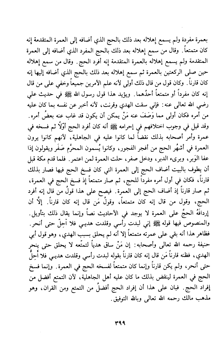 بعمرة مفردة ولم يسمع إهلاله بعد ذلك بالحج الذي أضافه إلى العمرة المتقدمة: إنه كان متمتعا. وقال: من سمع إهلاله بعد ذلك بالحج المفرد الذي أضافه إلى العمرة المتقدمة ولم يسمع إهلاله بالعمرة المتقدمة إنه أفرد الحج. وقال: من سمع إهلاله حين صلى الركعتين بالعمرة ثم سمع إهلاله بعد ذلك بالحج الذي أضافه إليها إنه كان قارنا. وكان قول من قال ذلك أولى؛ لأنه علم الأمرين جميعا وخفي على من قال: إنه كان مفردا أو متمتعا أو أحدهما. ويؤيد هذا قول رسول الله - صَلَّى اللَّهُ عَلَيْهِ وَسَلَّمَ - في حديث علي - رَضِيَ اللَّهُ تَعَالَى عَنْهُ -: «فإني سقت الهدي وقرنت» لأنه أخبر عن نفسه بما كان عليه من أمره فكان أولى مما وصف عنه من يمكن أن يكون قد غاب عنه بعض أمره. وقد قيل في وجوب اختلافهم في إحرامه - صَلَّى اللَّهُ عَلَيْهِ وَسَلَّمَ - أنه كان أفرد الحج أولا ثم فسخه في عمرة وأمر أصحابه بذلك نقضا لما كانوا عليه في الجاهلية، لأنهم كانوا يرون العمرة في أشهر الحج من أفجر الفجور، وكانوا يسمون المحرم صفر ويقولون إذا عفا الوبر، وبرئ الدبر، ودخل صفر، حلت العمرة لمن اعتمر. فلما قدم مكة قبل أن يطوف بالبيت أضاف الحج إلى العمرة التي كان فسخ الحج فيها فصار بذلك قارنا، فكان في أول أمره مفردا للحج، ثم صار متمتعا إذ فسخ الحج في العمرة، ثم صار قارنا إذ أضاف الحج إلى العمرة. فيصح على هذا قول من قال: إنه أفرد الحج، وقول من قال: إنه كان متمتعا، وقول من قال: إنه كان قارنا. إلا أن إردافه الحج على العمرة لا يوجد في الأحاديث نصا وإنما يقال ذلك بتأويل. والمنصوص فيها قوله - صَلَّى اللَّهُ عَلَيْهِ وَسَلَّمَ -: «إني لبدت رأسي وقلدت هديي فلا أحل حتى أنحر». فظاهر هذا أنه بقي على عمرته متمتعا إلا أنه لم يحلق بسبب الهدي، وهو قول أبي حنيفة - رَحِمَهُ اللَّهُ تَعَالَى - وأصحابه: إن من ساق هديا لتمتعه لا يحلق حتى ينحر الهدي، فظنه قارنا من قال: إنه كان قارنا بقوله «لبدت رأسي وقلدت هديي فلا أحل حتى أنحر» ولم يكن قارنا وإنما كان متمتعا لفسخه الحج في العمرة. وإنما فسخ الحج في العمرة لينقض بذلك ما كان عليه أهل الجاهلية، لأن التمتع أفضل من إفراد الحج. فبان على هذا أن إفراد الحج أفضل من التمتع ومن القران، وهو مذهب مالك - رَحِمَهُ اللَّهُ تَعَالَى - وبالله التوفيق.