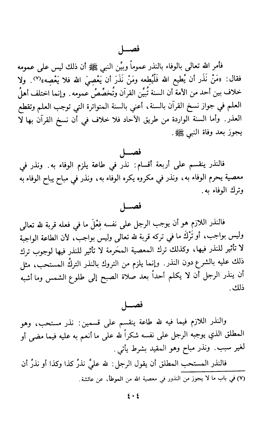 فأمر الله تعالى بالوفاء بالنذر عموما وبين النبي - صَلَّى اللَّهُ عَلَيْهِ وَسَلَّمَ - أن ذلك ليس على عمومه فقال: «من نذر أن يطيع الله فليطعه ومن نذر أن يعصي الله فلا يعصه». ولا خلاف بين أحد من الأمة أن السنة تبين القرآن وتخصص عمومه. وإنما اختلف أهل العلم في جواز نسخ القرآن بالسنة، أعني بالسنة المتواترة التي توجب العلم وتقطع العذر. وأما السنة الواردة من طريق الآحاد فلا خلاف في أن نسخ القرآن بها لا يجوز بعد وفاة النبي - صَلَّى اللَّهُ عَلَيْهِ وَسَلَّمَ -.