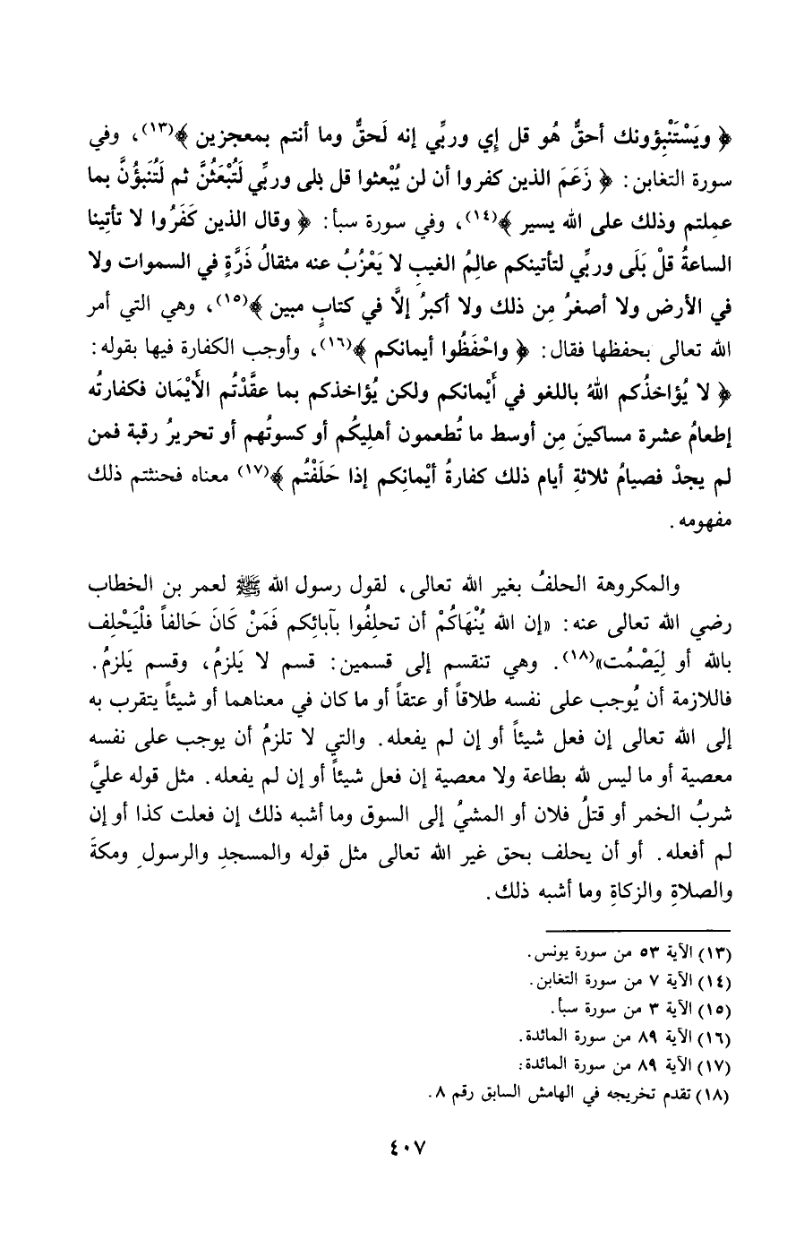 {وَيَسْتَنْبِئُونَكَ أَحَقٌّ هُوَ قُلْ إِي وَرَبِّي إِنَّهُ لَحَقٌّ وَمَا أَنْتُمْ بِمُعْجِزِينَ} [يونس: 53]، وفي سورة التغابن: {زَعَمَ الَّذِينَ كَفَرُوا أَنْ لَنْ يُبْعَثُوا قُلْ بَلَى وَرَبِّي لَتُبْعَثُنَّ ثُمَّ لَتُنَبَّؤُنَّ بِمَا عَمِلْتُمْ وَذَلِكَ عَلَى اللَّهِ يَسِيرٌ} [التغابن: 7]، وفي سورة سبأ: {وَقَالَ الَّذِينَ كَفَرُوا لا تَأْتِينَا السَّاعَةُ قُلْ بَلَى وَرَبِّي لَتَأْتِيَنَّكُمْ عَالِمِ الْغَيْبِ لا يَعْزُبُ عَنْهُ مِثْقَالُ ذَرَّةٍ فِي السَّمَاوَاتِ وَلا فِي الأَرْضِ وَلا أَصْغَرُ مِنْ ذَلِكَ وَلا أَكْبَرُ إِلا فِي كِتَابٍ مُبِينٍ} [سبأ: 3]، وهي التي أمر الله تعالى بحفظها فقال: {وَاحْفَظُوا أَيْمَانَكُمْ} [المائدة: 89]، وأوجب الكفارة فيها بقوله: {لا يُؤَاخِذُكُمُ اللَّهُ بِاللَّغْوِ فِي أَيْمَانِكُمْ وَلَكِنْ يُؤَاخِذُكُمْ بِمَا عَقَّدْتُمُ الأَيْمَانَ فَكَفَّارَتُهُ إِطْعَامُ عَشَرَةِ مَسَاكِينَ مِنْ أَوْسَطِ مَا تُطْعِمُونَ أَهْلِيكُمْ أَوْ كِسْوَتُهُمْ أَوْ تَحْرِيرُ رَقَبَةٍ فَمَنْ لَمْ يَجِدْ فَصِيَامُ ثَلاثَةِ أَيَّامٍ ذَلِكَ كَفَّارَةُ أَيْمَانِكُمْ إِذَا حَلَفْتُمْ} [المائدة: 89] معناه: فحنثتم، ذلك مفهومه.