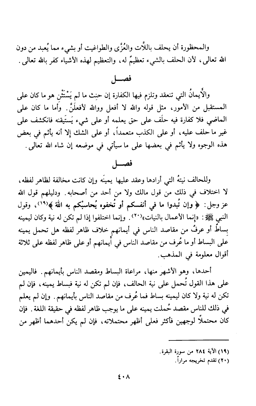 وللحالف نيته التي أرادها وعقد عليها يمينه وإن كانت مخالفة لظاهر لفظه، لا اختلاف في ذلك من قول مالك ولا من أحد من أصحابه. ودليلهم قول الله عز وجل: {وَإِنْ تُبْدُوا مَا فِي أَنْفُسِكُمْ أَوْ تُخْفُوهُ يُحَاسِبْكُمْ بِهِ اللَّهُ} [البقرة: 284]، وقول النبي - صَلَّى اللَّهُ عَلَيْهِ وَسَلَّمَ -: «إنما الأعمال بالنيات». وإنما اختلفوا إذا لم تكن له نية وكان ليمينه بساط أو عرف من مقاصد الناس في أيمانهم خلاف ظاهر لفظه هل تحمل يمينه على البساط أو ما عرف من مقاصد الناس في أيمانهم أو على ظاهر لفظه على ثلاثة أقوال معلومة في المذهب.