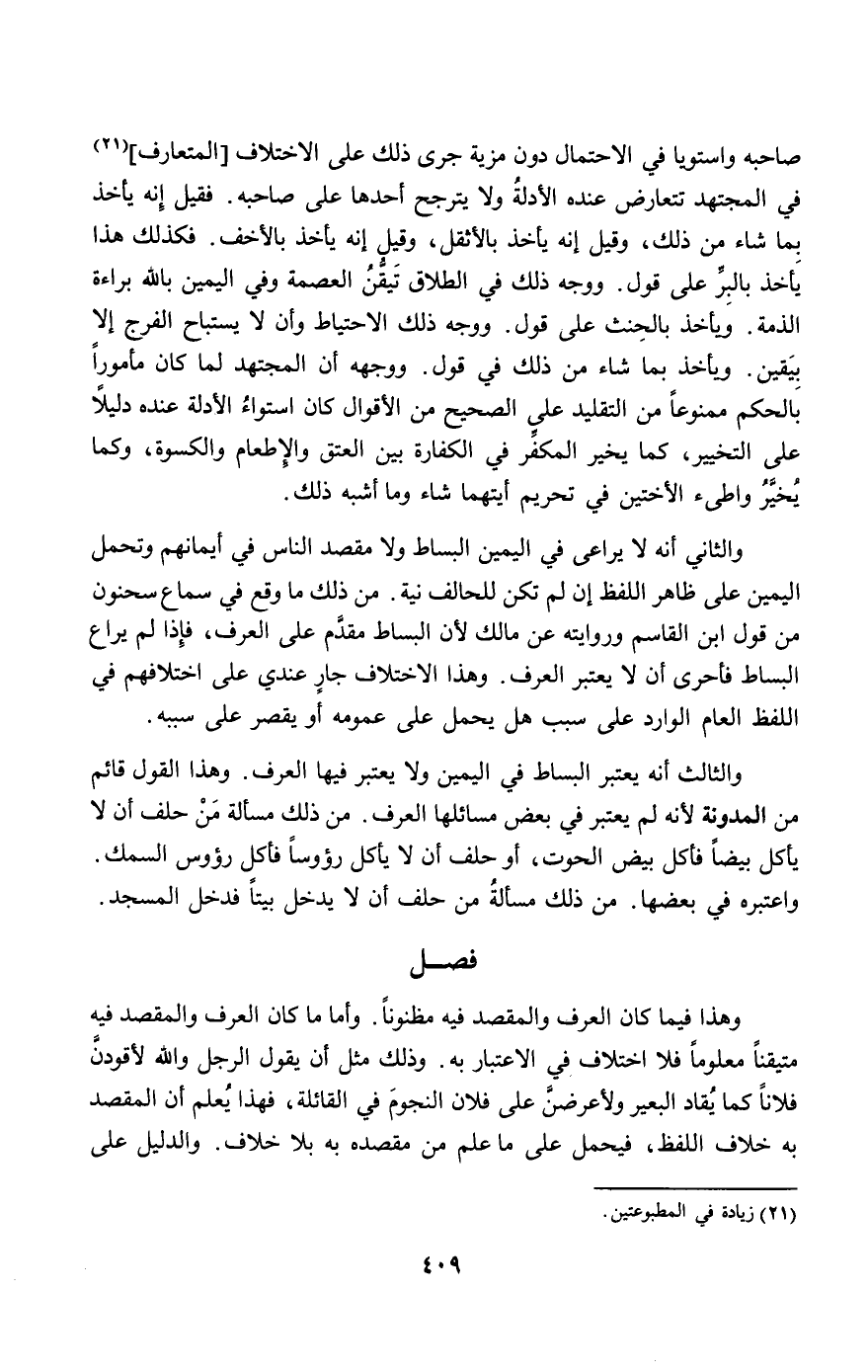 والثالث: أنه يعتبر البساط في اليمين ولا يعتبر فيها العرف. وهذا القول قائم من المدونة؛ لأنه لم يعتبر في بعض مسائلها العرف. من ذلك مسألة من حلف أن لا يأكل بيضا فأكل بيض الحوت، أو حلف أن لا يأكل رؤوسا فأكل رؤوس السمك. واعتبره في بعضها. من ذلك مسألة من حلف أن لا يدخل بيتا فدخل المسجد.