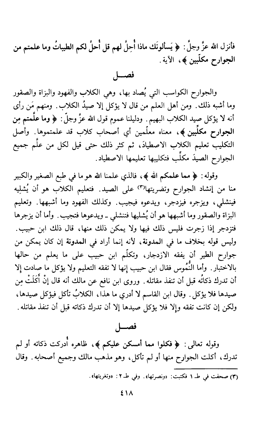 والجوارح الكواسب التي يصاد بها، وهي الكلاب والفهود والبزاة والصقور وما أشبه ذلك. ومن أهل العلم من قال لا يؤكل إلا صيد الكلاب. ومنهم من رأى أنه لا يؤكل صيد الكلاب البهيم. ودليلنا عموم قول الله عز وجل: {وَمَا عَلَّمْتُمْ مِنَ الْجَوَارِحِ مُكَلِّبِينَ} [المائدة: 4]، معناه: معلمين أي أصحاب كلاب قد علمتموها. وأصل التكليب تعليم الكلاب الاصطياد، ثم كثر ذلك حتى قيل لكل من علم جميع الجوارح الصيد مكلب فتكليبها تعليمها الاصطياد.