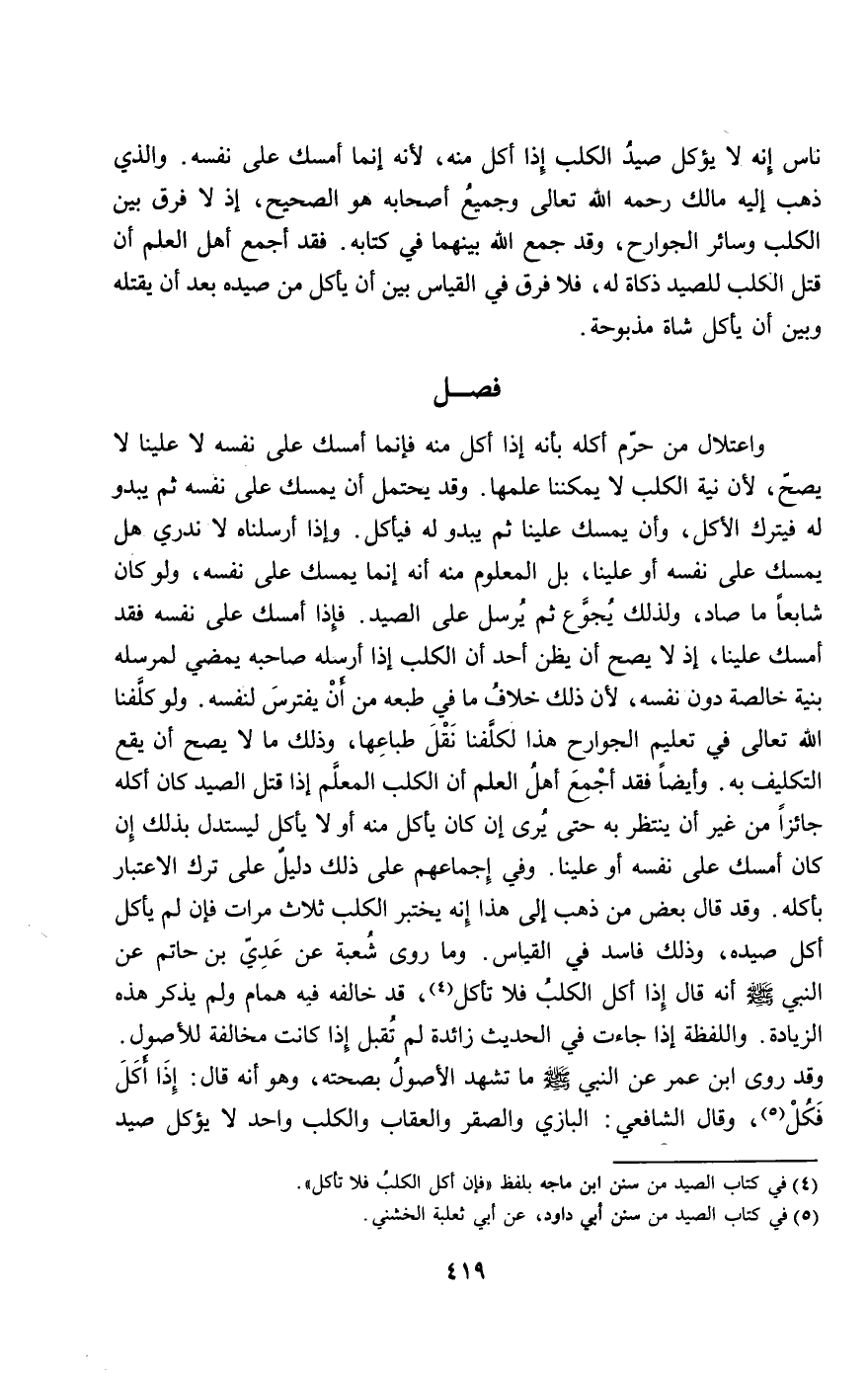 ناس: إنه لا يؤكل صيد الكلب إذا أكل منه؛ لأنه إنما أمسك على نفسه. والذي ذهب إليه مالك - رَحِمَهُ اللَّهُ تَعَالَى - وجميع أصحابه هو الصحيح، إذ لا فرق بين الكلب وسائر الجوارح، وقد جمع الله بينهما في كتابه. فقد أجمع أهل العلم أن قتل الكلب للصيد ذكاة له، فلا فرق في القياس بين أن يأكل من صيده بعد أن يقتله وبين أن يأكل شاة مذبوحة.