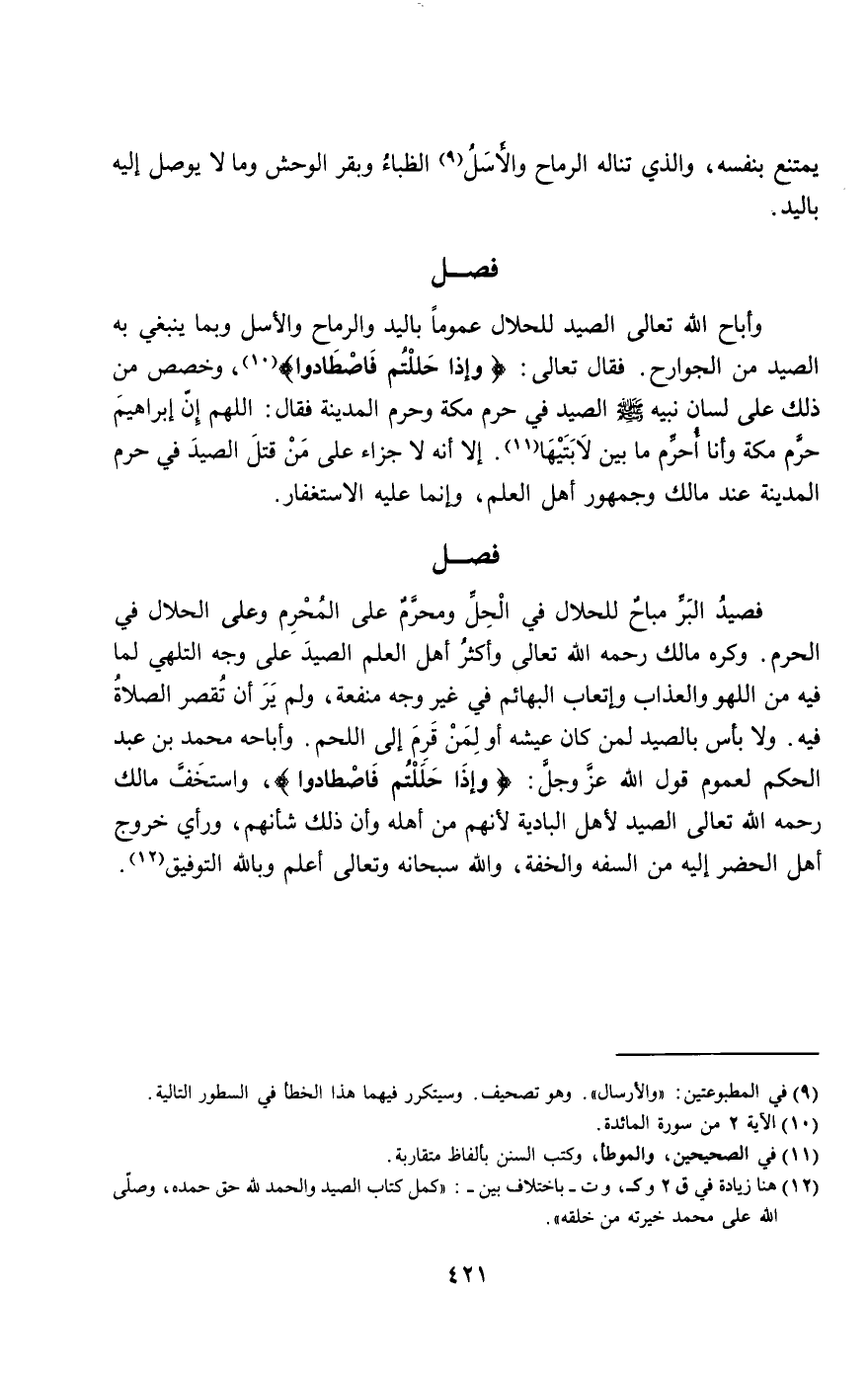 وأباح الله تعالى الصيد للحلال عموما باليد والرماح والأسل وبما ينبغي به الصيد من الجوارح. فقال تعالى: {وَإِذَا حَلَلْتُمْ فَاصْطَادُوا} [المائدة: 2]، وخصص من ذلك على لسان نبيه - صَلَّى اللَّهُ عَلَيْهِ وَسَلَّمَ - الصيد في حرم مكة وحرم المدينة فقال: «اللهم إن إبراهيم حرم مكة وأنا أحرم ما بين لابتيها». إلا أنه لا جزاء على من قتل الصيد في حرم المدينة عند مالك وجمهور أهل العلم، وإنما عليه الاستغفار.
