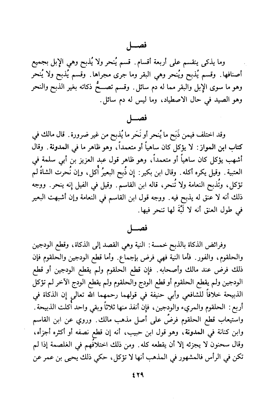 وما يذكى ينقسم على أربعة أقسام: قسم ينحر ولا يذبح وهي الإبل بجميع أصنافها. وقسم يذبح وينحر وهي البقر وما جرى مجراها. وقسم يذبح ولا ينحر وهو ما سوى الإبل والبقر مما له دم سائل. وقسم تصح ذكاته بغير الذبح والنحر وهو الصيد في حال الاصطياد، وما ليس له دم سائل.