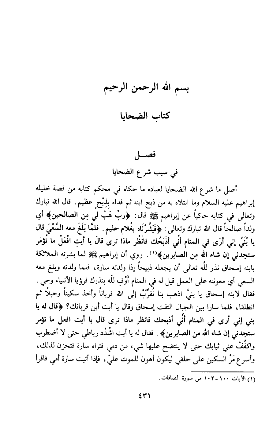 أصل ما شرع الله الضحايا لعباده ما حكاه في محكم كتابه من قصة خليله إبراهيم - عَلَيْهِ السَّلَامُ - وما ابتلاه به من ذبح ابنه ثم فداه بذبح عظيم. قال الله تبارك وتعالى في كتابه حاكيا عن إبراهيم - صَلَّى اللَّهُ عَلَيْهِ وَسَلَّمَ - قال: {رَبِّ هَبْ لِي مِنَ الصَّالِحِينَ} [الصافات: 100] أي ولدا صالحا قال الله تبارك وتعالى: {فَبَشَّرْنَاهُ بِغُلامٍ حَلِيمٍ} [الصافات: 101] {فَلَمَّا بَلَغَ مَعَهُ السَّعْيَ قَالَ يَا بُنَيَّ إِنِّي أَرَى فِي الْمَنَامِ أَنِّي أَذْبَحُكَ فَانْظُرْ مَاذَا تَرَى قَالَ يَا أَبَتِ افْعَلْ مَا تُؤْمَرُ سَتَجِدُنِي إِنْ شَاءَ اللَّهُ مِنَ الصَّابِرِينَ} [الصافات: 102]. روي أن إبراهيم - صَلَّى اللَّهُ عَلَيْهِ وَسَلَّمَ - لما بشرته الملائكة بابنه إسحاق نذر لله تعالى أن يجعله ذبيحا إذا ولدته سارة، فلما ولدته وبلغ معه السعي أي معونته على العمل قيل له في المنام: أوف لله بنذرك فرؤيا الأنبياء وحي. فقال لابنه إسحاق: يا بني اذهب بنا نقرب إلى الله قربانا، وأخذ سكينا وحبلا ثم انطلقا، فلما سارا بين الجبال التفت إسحاق وقال يا أبت أين قربانك؟ {قَالَ يَا بُنَيَّ إِنِّي أَرَى فِي الْمَنَامِ أَنِّي أَذْبَحُكَ فَانْظُرْ مَاذَا تَرَى قَالَ يَا أَبَتِ افْعَلْ مَا تُؤْمَرُ سَتَجِدُنِي إِنْ شَاءَ اللَّهُ مِنَ الصَّابِرِينَ} [الصافات: 102]. فقال له يا أبت اشدد رباطي حتى لا أضطرب واكفف عني ثيابك حتى لا ينتضح عليها شيء من دمي فتراه سارة فتحزن لذلك، وأسرع مر السكين على حلقي ليكون أهون للموت علي، فإذا أتيت سارة أمي فاقرأ