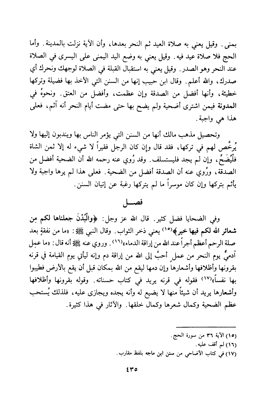 بمنى. وقيل: يعني به صلاة العيد ثم النحر بعدها، وأن الآية نزلت بالمدينة. وأما الحج فلا صلاة عيد فيه. وقيل: يعني به وضع اليد اليمنى على اليسرى في الصلاة عند النحر وهو الصدر. وقيل: يعني به استقبال القبلة في الصلاة لوجهك ونحرك أي صدرك، والله أعلم. وقال ابن حبيب: إنها من السنن التي الأخذ بها فضيلة وتركها خطيئة، وأنها أفضل من الصدقة وإن عظمت، وأفضل من العتق. ونحوه في المدونة فيمن اشترى أضحية ولم يضح بها حتى مضت أيام النحر أنه آثم، فعلى هذا هي واجبة.