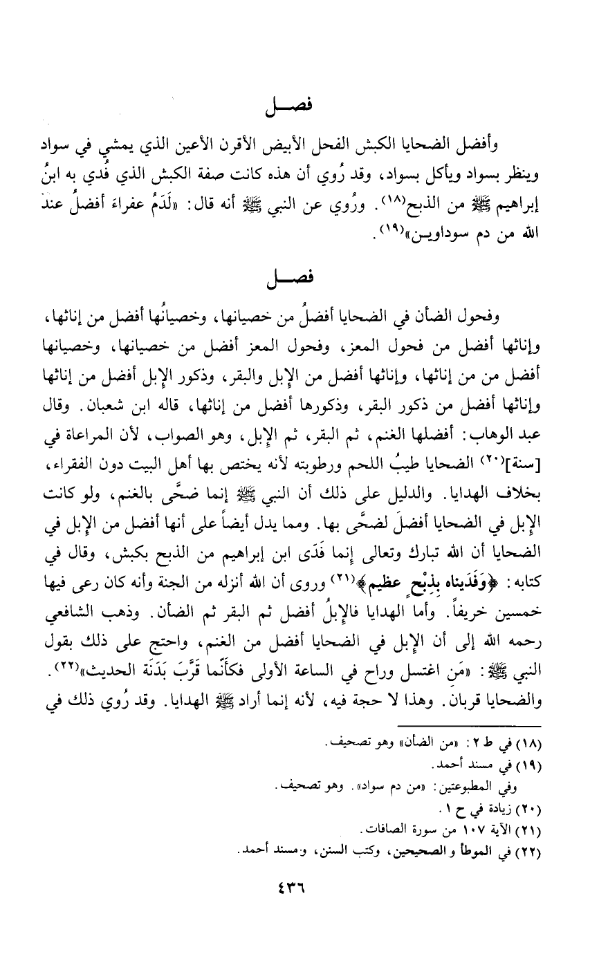وأفضل الضحايا الكبش الفحل الأبيض الأقرن الأعين الذي يمشي في سواد وينظر بسواد ويأكل بسواد، وقد روي أن هذه كانت صفة الكبش الذي فدي به ابن إبراهيم - صَلَّى اللَّهُ عَلَيْهِ وَسَلَّمَ - من الذبح. وروي عن النبي - صَلَّى اللَّهُ عَلَيْهِ وَسَلَّمَ - أنه قال: «لدم عفراء أفضل عند الله من دم سوداوين».