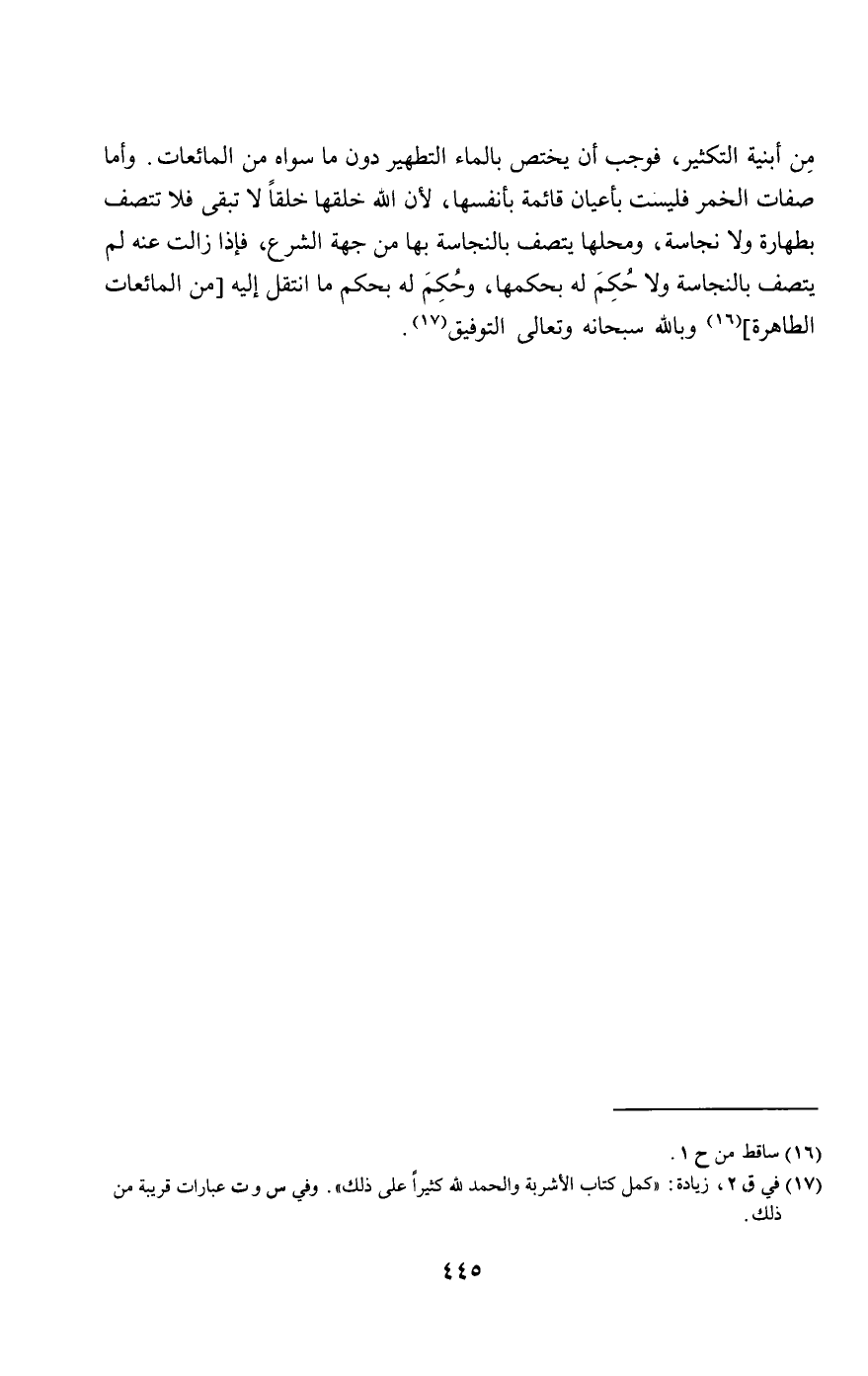 من أبنية التكثير، فوجب أن يختص بالماء التطهير دون ما سواه من المائعات. وأما صفات الخمر فليست بأعيان قائمة بأنفسها؛ لأن الله خلقها خلقا لا تبقى فلا تتصف بطهارة ولا نجاسة، ومحلها يتصف بالنجاسة بها من جهة الشرع، فإذا زالت عنه لم يتصف بالنجاسة ولا حكم له بحكمها، وحكم له بحكم ما انتقل إليه من المائعات الطاهرة، وبالله سبحانه وتعالى التوفيق.