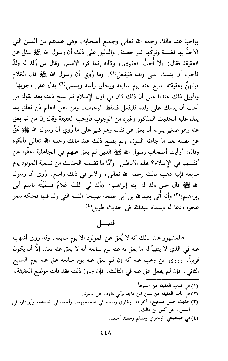 بواجبة عند مالك - رَحِمَهُ اللَّهُ تَعَالَى - وجميع أصحابه، وهي عندهم من السنن التي الأخذ بها فضيلة وتركها غير خطيئة. والدليل على ذلك «أن رسول الله - صَلَّى اللَّهُ عَلَيْهِ وَسَلَّمَ - سئل عن العقيقة فقال: لا أحب العقوق» وكأنه إنما كره الاسم، وقال: «من ولد له ولد فأحب أن ينسك على ولده فليفعل». وما روي «أن رسول الله - صَلَّى اللَّهُ عَلَيْهِ وَسَلَّمَ - قال: الغلام مرتهن بعقيقته تذبح عنه يوم سابعه ويحلق رأسه ويسمى» يدل على وجوبها. وتأويل ذلك عندنا على أن ذلك كان في أول الإسلام ثم نسخ ذلك بعد بقوله: «من أحب أن ينسك على ولده فليفعل» فسقط الوجوب. ومن أهل العلم من تعلق بما يدل عليه الحديث المذكور وغيره من الوجوب فأوجب العقيقة وقال: إن من لم يعق عنه وهو صغير يلزمه أن يعق عن نفسه وهو كبير على ما روي «أن رسول الله- صَلَّى اللَّهُ عَلَيْهِ وَسَلَّمَ - عق عن نفسه بعد ما جاءته النبوة» ولم يصح ذلك عند مالك - رَحِمَهُ اللَّهُ تَعَالَى - فأنكره وقال: أرأيت أصحاب رسول الله - صَلَّى اللَّهُ عَلَيْهِ وَسَلَّمَ - الذين لم يعق عنهم في الجاهلية أعقوا عن أنفسهم في الإسلام؟ هذه الأباطيل. وأما ما تضمنه الحديث من تسمية المولود يوم سابعه فإليه ذهب مالك - رَحِمَهُ اللَّهُ تَعَالَى -، والأمر في ذلك واسع. «روي أن رسول الله - صَلَّى اللَّهُ عَلَيْهِ وَسَلَّمَ - قال حين ولد له ابنه إبراهيم: "ولد لي الليلة غلام فسميته باسم أبى إبراهيم» «وأنه أتي بعبد الله بن أبي طلحة صبيحة الليلة التي ولد فيها فحنكه بتمر عجوة ودعا له وسماه عبد الله» في حديث طويل.