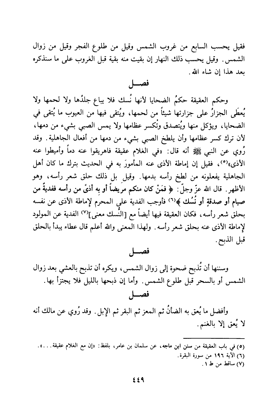 وحكم العقيقة حكم الضحايا؛ لأنها نسك فلا يباع جلدها ولا لحمها ولا يعطى الجزار على جزارتها شيئا من لحمها، ويتقى فيها من العيوب ما يتقى في الضحايا، ويؤكل منها ويتصدق وتكسر عظامها ولا يمس الصبي بشيء من دمها؛ لأن ترك كسر عظامها وأن يلطخ الصبي بشيء من دمها من أفعال الجاهلية. وقد روي عن النبي - صَلَّى اللَّهُ عَلَيْهِ وَسَلَّمَ - أنه قال: «في الغلام عقيقة فأهريقوا عنه دما وأميطوا عنه الأذى»، فقيل: إن إماطة الأذى عنه المأمور به في الحديث بترك ما كان أهل الجاهلية يفعلونه من لطخ رأسه بدمها. وقيل بل ذلك حلق شعر رأسه، وهو الأظهر. قال الله عز وجل: {فَمَنْ كَانَ مِنْكُمْ مَرِيضًا أَوْ بِهِ أَذًى مِنْ رَأْسِهِ فَفِدْيَةٌ مِنْ صِيَامٍ أَوْ صَدَقَةٍ أَوْ نُسُكٍ} [البقرة: 196] فأوجب الفدية على المحرم لإماطة الأذى عن نفسه بحلق شعر رأسه، فكان العقيقة فيها أيضا مع [النسك معنى] الفدية عن المولود لإماطة الأذى عنه بحلق شعر رأسه. ولهذا المعنى والله أعلم قال عطاء: يبدأ بالحلق قبل الذبح.
