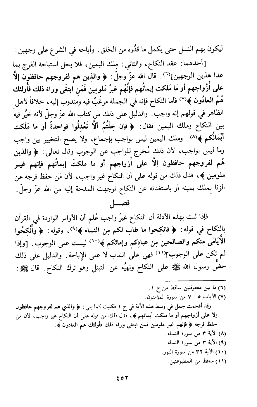 ليكون بهم النسل حتى يكمل ما قدره من الخلق. وأباحه في الشرع على وجهين: [أحدهما: عقد النكاح، والثاني: ملك اليمين، فلا يحل استباحة الفرج بما عدا هذين الوجهين]. قال الله عز وجل: {وَالَّذِينَ هُمْ لِفُرُوجِهِمْ حَافِظُونَ} [المؤمنون: 5] {إِلا عَلَى أَزْوَاجِهِمْ أوْ مَا مَلَكَتْ أَيْمَانُهُمْ فَإِنَّهُمْ غَيْرُ مَلُومِينَ} [المؤمنون: 6] {فَمَنِ ابْتَغَى وَرَاءَ ذَلِكَ فَأُولَئِكَ هُمُ الْعَادُونَ} [المؤمنون: 7] فأما النكاح فإنه في الجملة مرغب فيه ومندوب إليه، خلافا لأهل الظاهر في قولهم إنه واجب. والدليل على ذلك من كتاب الله عز وجل؛ لأنه خير فيه بين النكاح وملك اليمين فقال: {فَإِنْ خِفْتُمْ أَلا تَعْدِلُوا فَوَاحِدَةً أَوْ مَا مَلَكَتْ أَيْمَانُكُمْ} [النساء: 3]. وملك اليمين ليس بواجب بإجماع، ولا يصح التخيير بين واجب وما ليس بواجب؛ لأن ذلك مخرج للواجب عن الوجوب وقال تعالى: {وَالَّذِينَ هُمْ لِفُرُوجِهِمْ حَافِظُونَ} [المؤمنون: 5] {إِلا عَلَى أَزْوَاجِهِمْ أوْ مَا مَلَكَتْ أَيْمَانُهُمْ فَإِنَّهُمْ غَيْرُ مَلُومِينَ} [المؤمنون: 6]، فدل ذلك من قوله على أن النكاح غير واجب؛ لأن من حفظ فرجه عن الزنا بملك يمينه أو باستغنائه عن النكاح توجهت المدحة إليه من الله عز وجل.