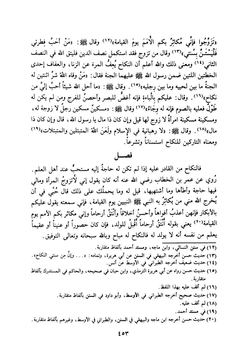 «تزوجوا فإني مكاثر بكم الأمم يوم القيامة» وقال - صَلَّى اللَّهُ عَلَيْهِ وَسَلَّمَ -: «من أحب فطرتي فليستن بسنتي» وقال: «من تزوج فقد استكمل نصف الدين فليتق الله في النصف الثاني» ومعنى ذلك والله أعلم أن النكاح يعف المرء عن الزنا، والعفاف إحدى الخطتين اللتين ضمن رسول الله - صَلَّى اللَّهُ عَلَيْهِ وَسَلَّمَ - عليهما الجنة فقال: «من وقاه الله شر اثنتين له الجنة ما بين لحييه وما بين رجليه». وقال - صَلَّى اللَّهُ عَلَيْهِ وَسَلَّمَ -: «ما أحل الله شيئا أحب إلي من نكاح». وقال: «عليكم بالباءة فإنه أغض للبصر وأحصن للفرج، ومن لم يكن له طول فعليه بالصوم فإنه له وجاء» وقال - صَلَّى اللَّهُ عَلَيْهِ وَسَلَّمَ -: «مسكين مسكين رجل لا زوجة له، ومسكينة مسكينة امرأة لا زوج لها قيل وإن كان ذا مال يا رسول الله، قال وإن كان ذا مال». وقال - صَلَّى اللَّهُ عَلَيْهِ وَسَلَّمَ -: «لا رهبانية في الإسلام ولعن الله المتبتلين والمتبتلات» ومعناه التاركين للنكاح استسنانا وتشرعا.