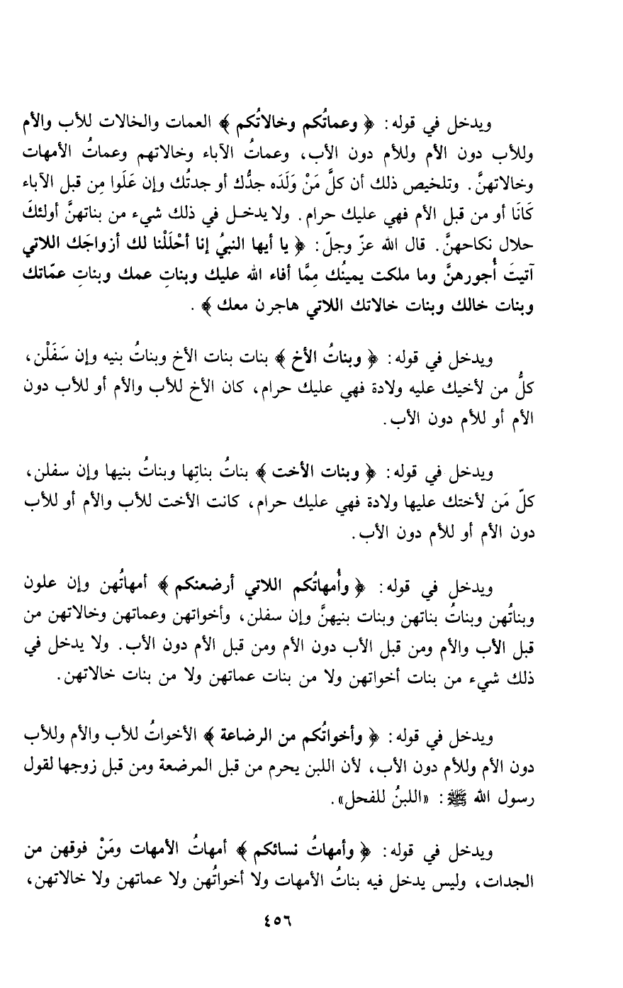 ويدخل في قوله: {وَبَنَاتُ الأَخِ} [النساء: 23] بنات بنات الأخ وبنات بنيه وإن سفلن، كل من لأخيك عليه ولادة فهي عليك حرام، كان الأخ للأب والأم أو للأب دون الأم أو للأم دون الأب.