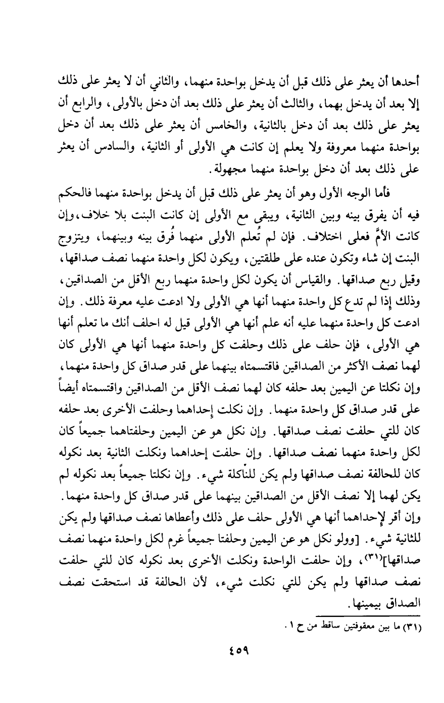 أحدها: أن يعثر على ذلك قبل أن يدخل بواحدة منهما، والثاني: أن لا يعثر على ذلك إلا بعد أن يدخل بهما، والثالث: أن يعثر على ذلك بعد أن دخل بالأولى، والرابع: أن يعثر على ذلك بعد أن دخل بالثانية، والخامس: أن يعثر على ذلك بعد أن دخل بواحدة منهما معروفة ولا يعلم إن كانت هي الأولى أو الثانية، والسادس: أن يعثر على ذلك بعد أن دخل بواحدة منهما مجهولة.