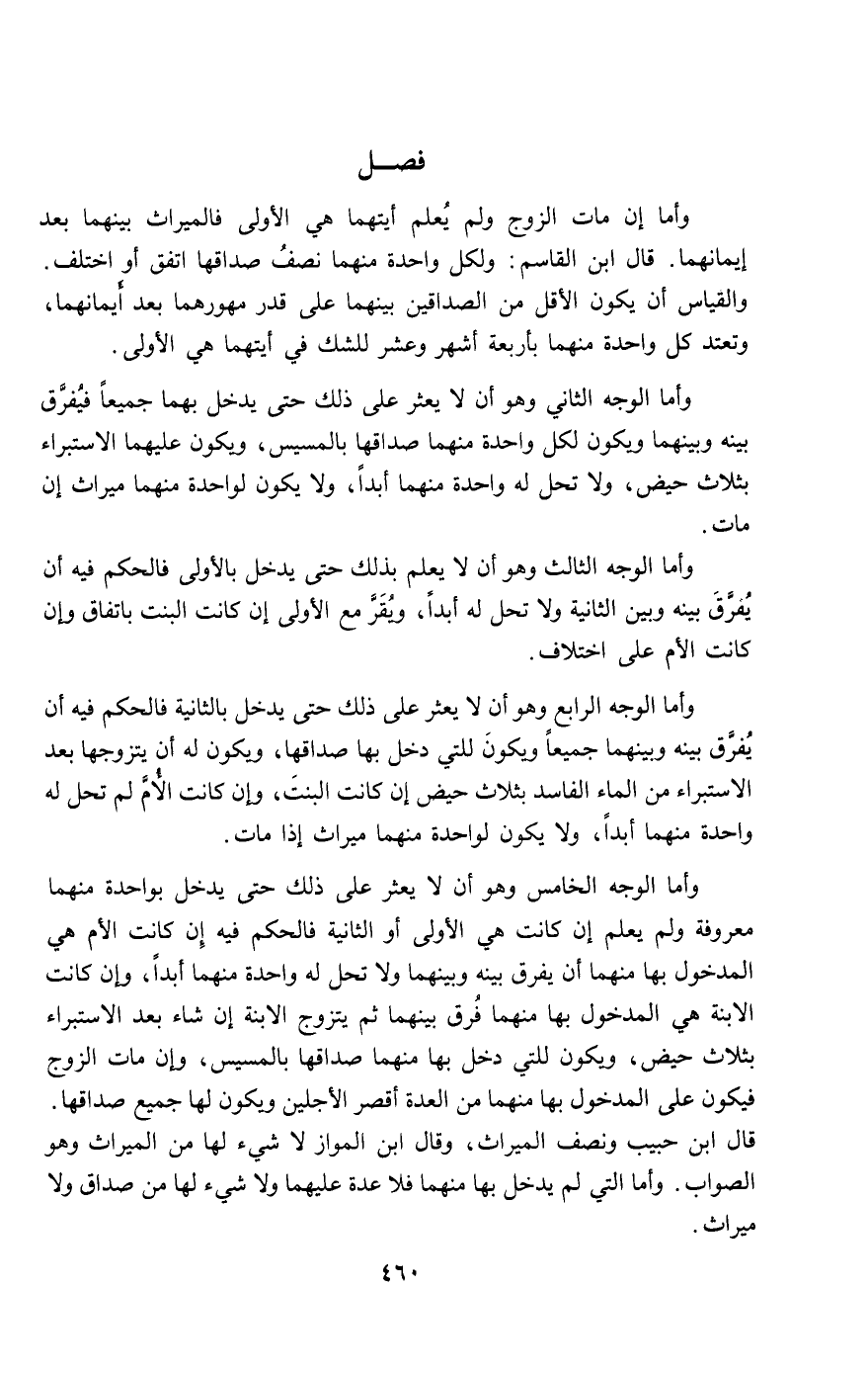 وأما الوجه الخامس وهو أن لا يعثر على ذلك حتى يدخل بواحدة منهما معروفة ولم يعلم إن كانت هي الأولى أو الثانية فالحكم فيه إن كانت الأم هي المدخول بها منهما أن يفرق بينه وبينهما ولا تحل له واحدة منهما أبدا، وإن كانت الابنة هي المدخول بها منهما فرق بينهما ثم يتزوج الابنة إن شاء بعد الاستبراء بثلاث حيض، ويكون للتي دخل بها منهما صداقها بالمسيس، وإن مات الزوج فيكون على المدخول بها منهما من العدة أقصر الأجلين ويكون لها جميع صداقها. قال ابن حبيب ونصف الميراث، وقال ابن المواز لا شيء لها من الميراث وهو الصواب. وأما التي لم يدخل بها منهما فلا عدة عليهما ولا شيء لها من صداق ولا ميراث.