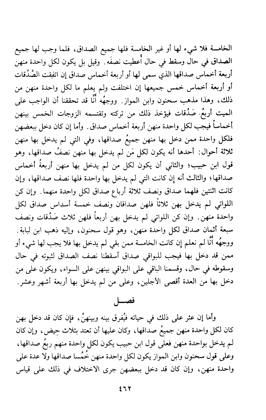 الخامسة فلا شيء لها أو غير الخامسة فلها جميع الصداق، فلما وجب لها جميع الصداق في حال وسقط في حال أعطيت نصفه. وقيل: بل يكون لكل واحدة منهن أربعة أخماس صداقها الذي سمي لها أو أربعة أخماس صداق إن اتفقت الصدقات أو أربعة أخماس خمس جميعها إن اختلفت ولم يعلم ما لكل واحدة منهن من ذلك، وهذا مذهب سحنون وابن المواز. ووجهه أنا قد تحققنا أن الواجب على الميت أربع- صدقات فيؤخذ ذلك من تركته وتقتسمه الزوجات الخمس بينهن أخماسا فيجب لكل واحدة منهن أربعة أخماس صداق. وأما إن كان دخل ببعضهن فلكل واحدة ممن دخل بها منهن جميع صداقها، وفي التي لم يدخل بها منهن ثلاثة أحوال: أحدها: أنه يكون لكل من لم يدخل بها منهن نصف صداقها، وهو قول ابن حبيب، والثاني: أن يكون لكل من لم يدخل بها منهن أربعة أخماس صداقها، والثالث: أنه إن كانت التي لم يدخل بها واحدة فلها نصف صداقها، وإن كانت اثنتين فلهما صداق ونصف ثلاثة أرباع صداق لكل واحدة منهما. وإن كن اللواتي لم يدخل بهن ثلاثا فلهن صداقان ونصف خمسة أسداس صداق لكل واحدة منهن. وإن كن اللواتي لم يدخل بهن أربعا فلهن ثلاث صدقات ونصف سبعة أثمان صداق لكل واحدة منهن، وهو قول سحنون، وإليه ذهب ابن لبابة. ووجهه أنا لم نعلم إن كانت الخامسة ممن بقي لم يدخل بها فلا يجب لها شيء أو ممن قد دخل بها فيجب للبواقي صداق أسقطنا نصف الصداق لثبوته في حال وسقوطه في حال، وقسمنا الباقي على البواقي بينهن على السواء، ويكون على من دخل بها من العدة أقصى الأجلين، وعلى من لم يدخل بها أربعة أشهر وعشر.