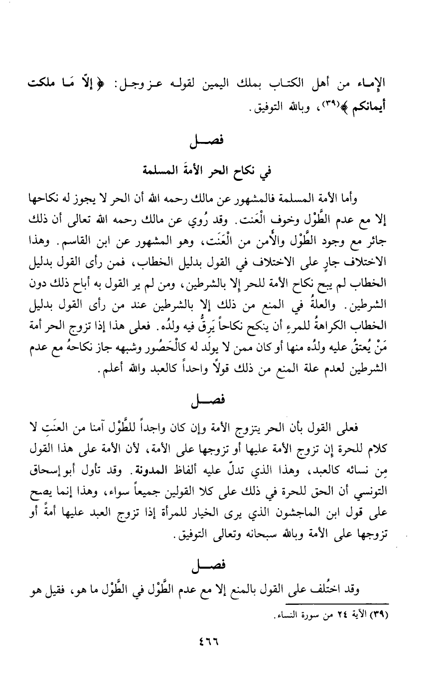 وأما الأمة المسلمة فالمشهور عن مالك - رَحِمَهُ اللَّهُ - أن الحر لا يجوز له نكاحها إلا مع عدم الطول وخوف العنت. وقد روي عن مالك - رَحِمَهُ اللَّهُ تَعَالَى - أن ذلك جائر مع وجود الطول والأمن من العنت، وهو المشهور عن ابن القاسم. وهذا الاختلاف جار على الاختلاف في القول بدليل الخطاب، فمن رأى القول بدليل الخطاب لم يبح نكاح الأمة للحر إلا بالشرطين، ومن لم ير القول به أباح ذلك دون الشرطين. والعلة في المنع من ذلك إلا بالشرطين عند من رأى القول بدليل الخطاب الكراهة للمرء أن ينكح نكاحا يرق فيه ولده. فعلى هذا إذا تزوج الحر أمة من يعتق عليه ولده منها أو كان ممن لا يولد له كالحصور وشبهه جاز نكاحه مع عدم الشرطين لعدم علة المنع من ذلك قولا واحدا كالعبد والله أعلم.
