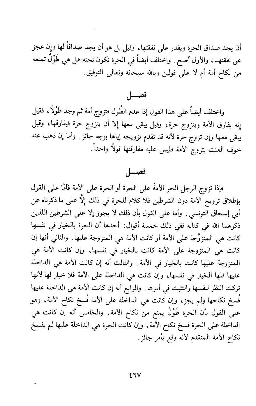واختلف أيضا على هذا القول إذا عدم الطول فتزوج أمة ثم وجد طولا، فقيل: إنه يفارق الأمة ويتزوج حرة، وقيل: يبقى معها إلا أن يتزوج حرة فيفارقها، وقيل: يبقى معها وإن تزوج حرة؛ لأنه قد تقدم تزويجه إياها بوجه جائز. وأما إن ذهب عنه خوف العنت بتزوج الأمة فليس عليه مفارقتها قولا واحدا.