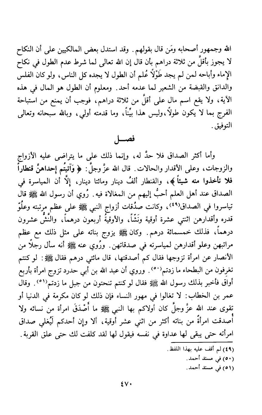 الله وجمهور أصحابه ومن قال بقولهم. وقد استدل بعض المالكيين على أن النكاح لا يجوز بأقل من ثلاثة دراهم بأن قال: إن الله تعالى لما شرط عدم الطول في نكاح الإماء وأباحه لمن لم يجد طولا علم أن الطول لا يجده كل الناس، ولو كان الفلس والدانق والقبضة من الشعير لما عدمه أحد. ومعلوم أن الطول هو المال في هذه الآية، ولا يقع اسم مال على أقل من ثلاثة دراهم، فوجب أن يمنع من استباحة الفرج بما لا يكون طولا، وليس هذا بينا، وما قدمته أولى، وبالله سبحانه وتعالى التوفيق.