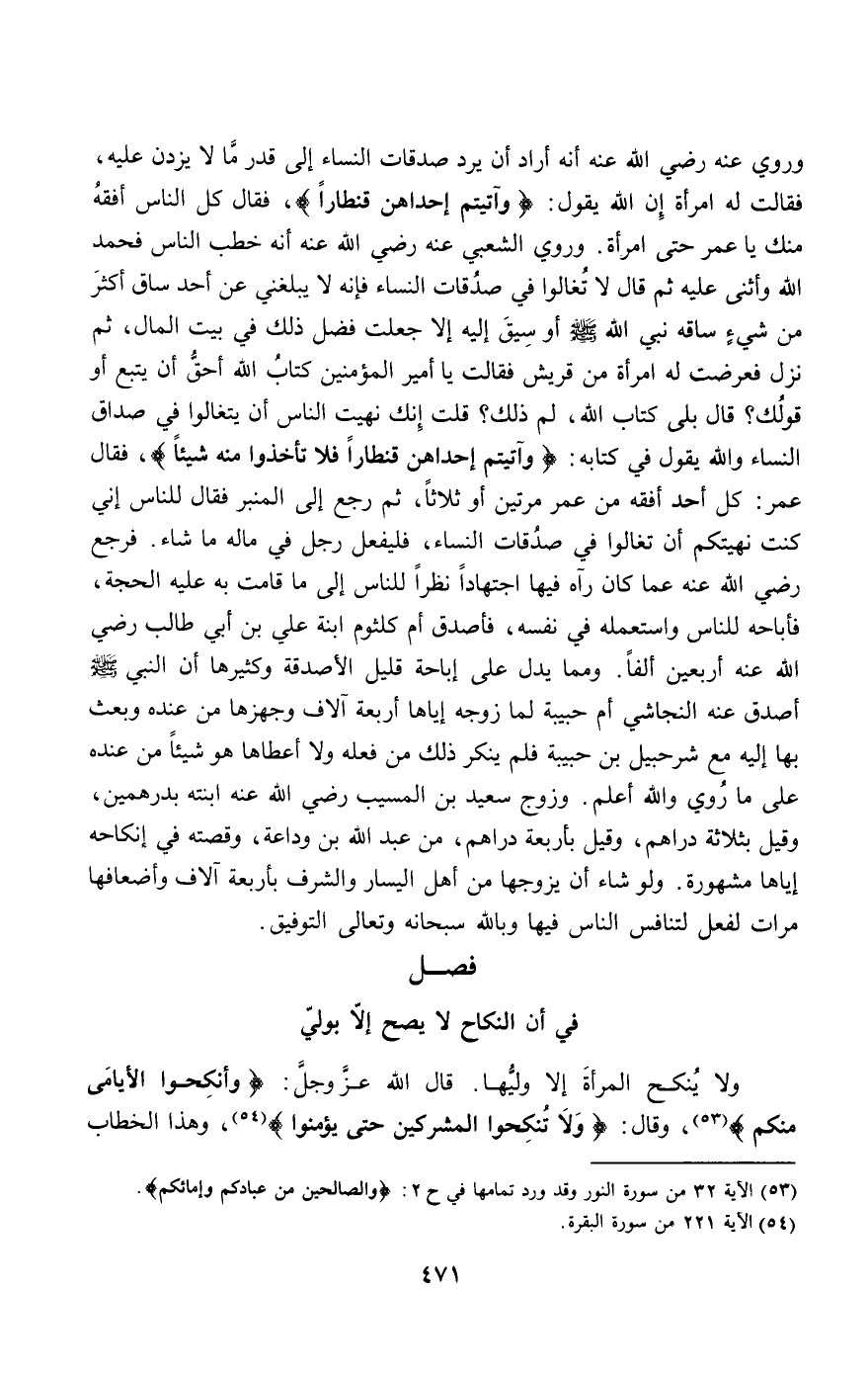 وروي عنه - رَضِيَ اللَّهُ عَنْهُ - أنه أراد أن يرد صدقات النساء إلى قدر ما لا يزدن عليه، فقالت له امرأة؛ إن الله يقول: {وَآتَيْتُمْ إِحْدَاهُنَّ قِنْطَارًا} [النساء: 20]، فقال: كل الناس أفقه منك يا عمر حتى امرأة. وروى الشعبي عنه - رَضِيَ اللَّهُ عَنْهُ - أنه خطب الناس فحمد الله وأثنى عليه ثم قال: لا تغالوا في صدقات النساء فإنه لا يبلغني عن أحد ساق أكثر من شيء ساقه نبي الله - صَلَّى اللَّهُ عَلَيْهِ وَسَلَّمَ - أو سيق إليه إلا جعلت فضل ذلك في بيت المال، ثم نزل فعرضت له امرأة من قريش فقالت: يا أمير المؤمنين كتاب الله أحق أن يتبع أو قولك؟ قال: بلى، كتاب الله، لم ذلك؟ قالت: إنك نهيت الناس أن يتغالوا في صداق النساء والله يقول في كتابه: {وَآتَيْتُمْ إِحْدَاهُنَّ قِنْطَارًا فَلا تَأْخُذُوا مِنْهُ شَيْئًا} [النساء: 20]، فقال عمر: كل أحد أفقه من عمر مرتين أو ثلاثا، ثم رجع إلى المنبر، فقال للناس: إني كنت نهيتكم أن تغالوا في صدقات النساء، فليفعل رجل في ماله ما شاء. فرجع - رَضِيَ اللَّهُ عَنْهُ - عما كان رآه فيها اجتهادا نظرا للناس إلى ما قامت به عليه الحجة، فأباحه للناس واستعمله في نفسه، فأصدق أم كلثوم ابنة علي بن أبي طالب - رَضِيَ اللَّهُ عَنْهُ - أربعين ألفا. ومما يدل على إباحة قليل الأصدقة وكثيرها «أن النبي - صَلَّى اللَّهُ عَلَيْهِ وَسَلَّمَ - أصدق عنه النجاشي أم حبيبة لما زوجه إياها أربعة آلاف وجهزها من عنده وبعث بها إليه مع شرحبيل بن حبيبة» فلم ينكر ذلك من فعله ولا أعطاها هو شيئا من عنده على ما روي والله أعلم. وزوج سعيد بن المسيب - رَضِيَ اللَّهُ عَنْهُ - ابنته بدرهمين، وقيل بثلاثة دراهم، وقيل بأربعة دراهم، من عبد الله بن وداعة، وقصته في إنكاحه إياها مشهورة. ولو شاء أن يزوجها من أهل اليسار والشرف بأربعة آلاف وأضعافها مرات لفعل لتنافس الناس فيها وبالله سبحانه وتعالى التوفيق.
