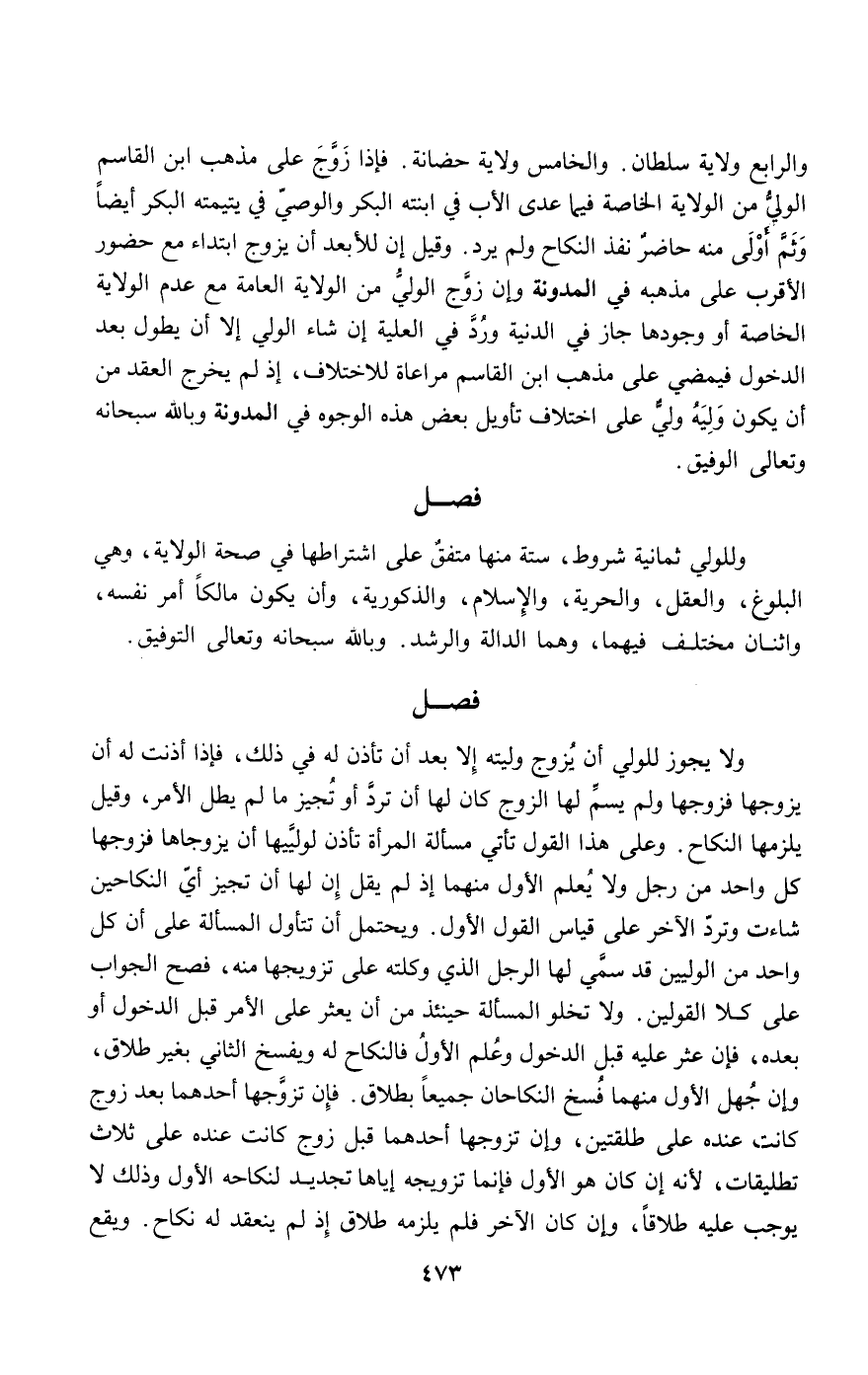 وللولي ثمانية شروط، ستة منها متفق على اشتراطها في صحة الولاية، وهي البلوغ، والعقل، والحرية، والإسلام، والذكورية، وأن يكون مالكا أمر نفسه، واثنان مختلف فيهما، وهما الدالة والرشد. وبالله سبحانه وتعالى التوفيق.