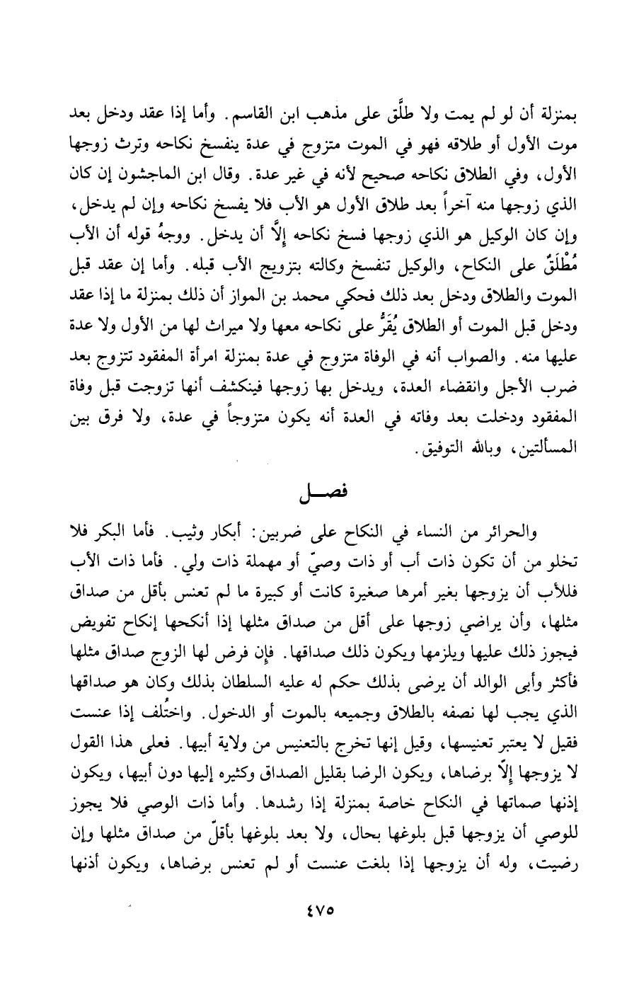 والحرائر من النساء في النكاح على ضربين: أبكار وثيب. فأما البكر فلا تخلو من أن تكون ذات أب أو ذات وصي أو مهملة ذات ولي. فأما ذات الأب فللأب أن يزوجها بغير أمرها صغيرة كانت أو كبيرة ما لم تعنس بأقل من صداق مثلها، وأن يراضي زوجها على أقل من صداق مثلها إذا أنكحها إنكاح تفويض فيجوز ذلك عليها ويلزمها ويكون ذلك صداقها. فإن فرض لها الزوج صداق مثلها فأكثر وأبى الوالد أن يرضى بذلك حكم له عليه السلطان بذلك وكان هو صداقها الذي يجب لها نصفه بالطلاق وجميعه بالموت أو الدخول. واختلف إذا عنست فقيل لا يعتبر تعنيسها، وقيل: إنها تخرج بالتعنيس من ولاية أبيها. فعلى هذا القول لا يزوجها إلا برضاها، ويكون الرضا بقليل الصداق وكثيره إليها دون أبيها، ويكون إذنها صماتها في النكاح خاصة بمنزلة إذا رشدها. وأما ذات الوصي فلا يجوز للوصي أن يزوجها قبل بلوغها بحال، ولا بعد بلوغها بأقل من صداق مثلها وإن رضيت، وله أن يزوجها إذا بلغت عنست أو لم تعنس برضاها، ويكون إذنها