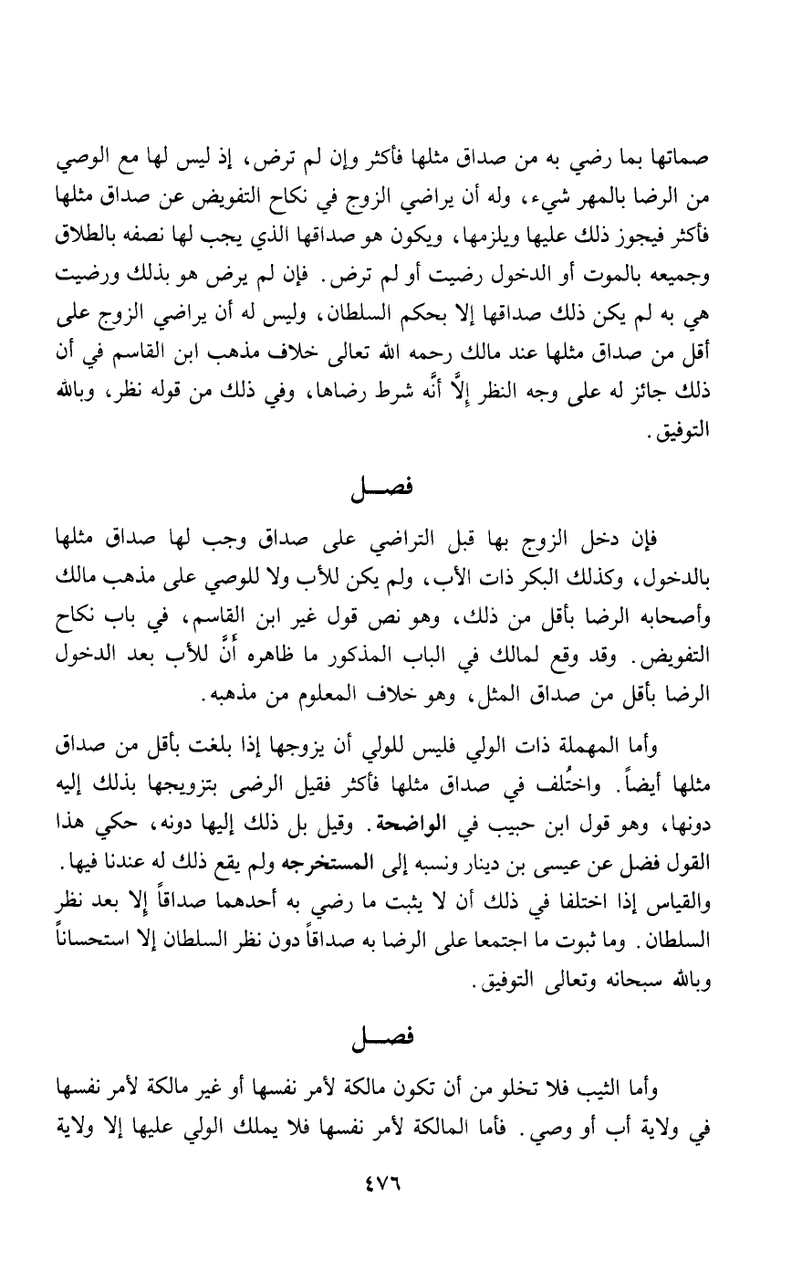 صماتها بما رضي به من صداق مثلها فأكثر وإن لم ترض، إذ ليس لها مع الوصي من الرضا بالمهر شيء، وله أن يراضي الزوج في نكاح التفويض عن صداق مثلها فأكثر فيجوز ذلك عليها ويلزمها، ويكون هو صداقها الذي يجب لها نصفه بالطلاق وجميعه بالموت أو الدخول رضيت أو لم ترض. فإن لم يرض هو بذلك ورضيت هي به لم يكن ذلك صداقها إلا بحكم السلطان، وليس له أن يراضي الزوج على أقل من صداق مثلها عند مالك - رَحِمَهُ اللَّهُ تَعَالَى - خلاف مذهب ابن القاسم في أن ذلك جائز له على وجه النظر إلا أنه شرط رضاها، وفي ذلك من قوله نظر، وبالله التوفيق.