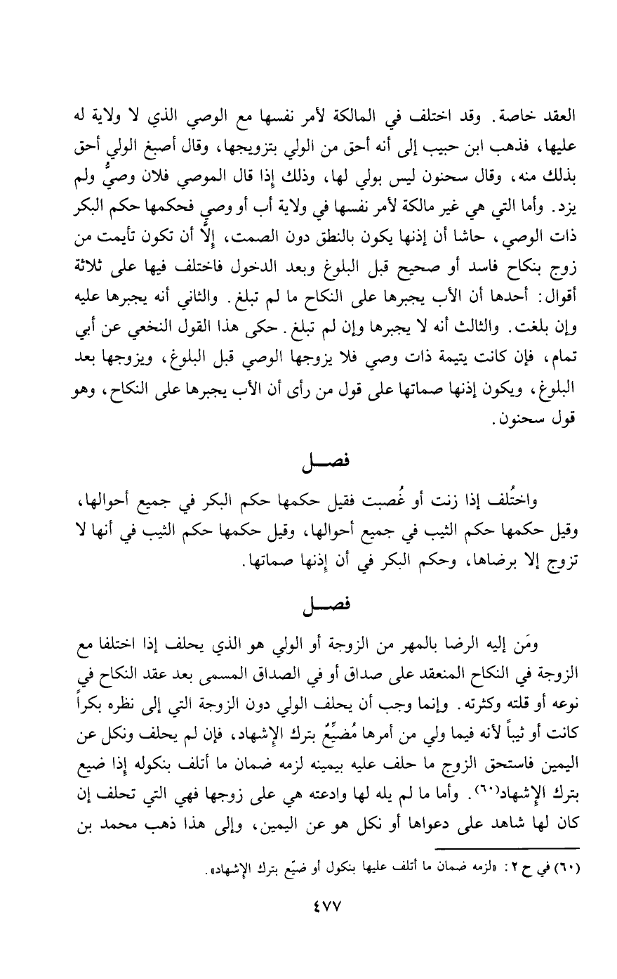 العقد خاصة. وقد اختلف في المالكة لأمر نفسها مع الوصي الذي لا ولاية له عليها، فذهب ابن حبيب إلى أنه أحق من الولي بتزويجها، وقال أصبغ: الولي أحق بذلك منه، وقال سحنون: ليس بولي لها، وذلك إذا قال الموصي فلان وصي ولم يزد. وأما التي هي غير مالكة لأمر نفسها في ولاية أب أو وصي فحكمها حكم البكر ذات الوصي، حاشا أن إذنها يكون بالنطق دون الصمت، إلا أن تكون تأيمت من زوج بنكاح فاسد أو صحيح قبل البلوغ وبعد الدخول فاختلف فيها على ثلاثة أقوال: أحدها: أن الأب يجبرها على النكاح ما لم تبلغ. والثاني: أنه يجبرها عليه وإن بلغت. والثالث: أنه لا يجبرها وإن لم تبلغ. حكى هذا القول النخعي عن أبي تمام، فإن كانت يتيمة ذات وصي فلا يزوجها الوصي قبل البلوغ، ويزوجها بعد البلوغ، ويكون إذنها صماتها على قول من رأى أن الأب يجبرها على النكاح، وهو قول سحنون.