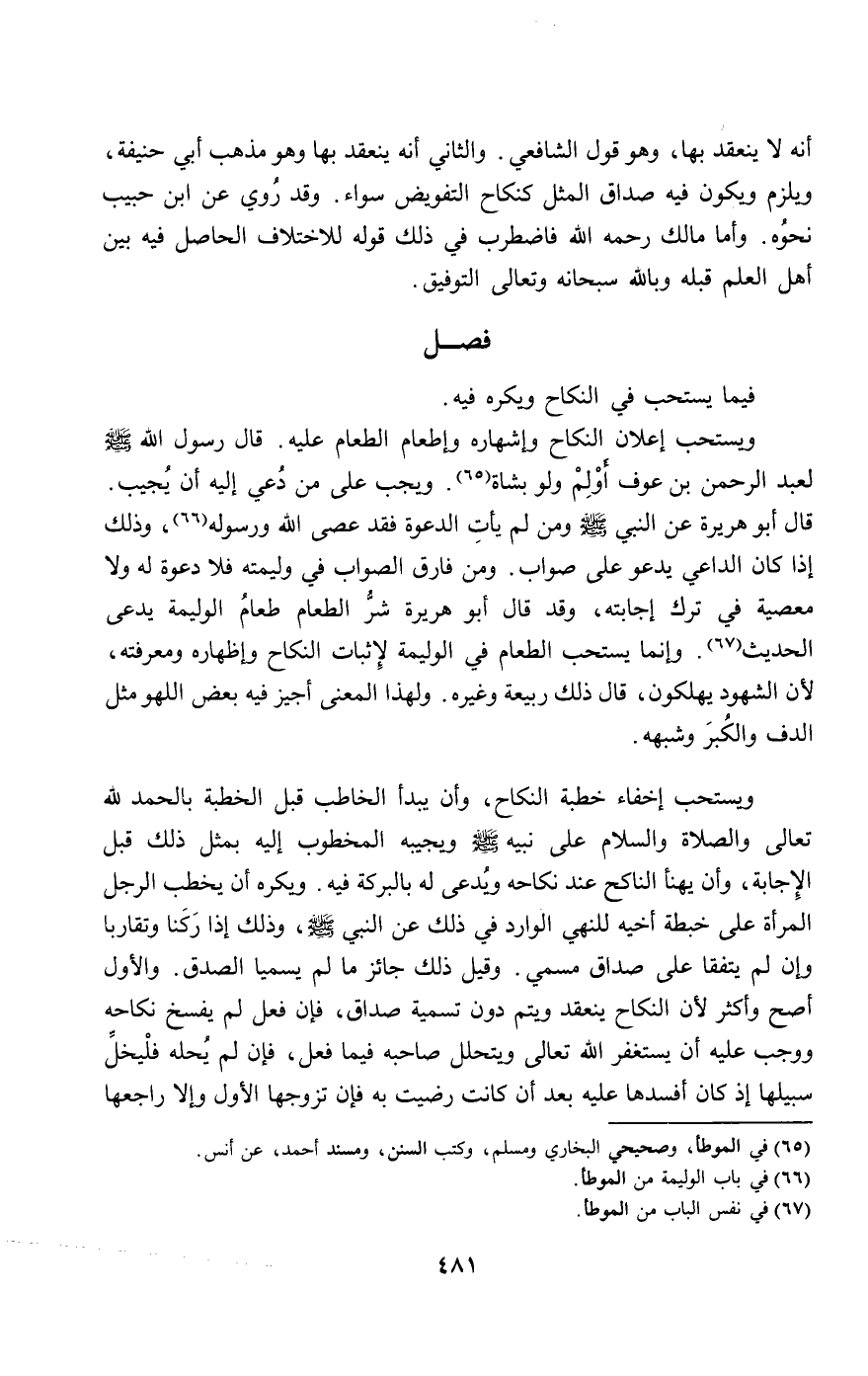 فيما يستحب في النكاح ويكره فيه. ويستحب إعلان النكاح وإشهاره وإطعام الطعام عليه. قال رسول الله - صَلَّى اللَّهُ عَلَيْهِ وَسَلَّمَ - لعبد الرحمن بن عوف: «أولم ولو بشاة». ويجب على من دعي إليه أن يجيب. قال أبو هريرة عن النبي - صَلَّى اللَّهُ عَلَيْهِ وَسَلَّمَ -: «ومن لم يأت الدعوة فقد عصى الله ورسوله» وذلك إذا كان الداعي يدعو على صواب. ومن فارق الصواب في وليمته فلا دعوة له ولا معصية في ترك إجابته، وقد قال أبو هريرة: شر الطعام طعام الوليمة يدعى ... الحديث. وإنما يستحب الطعام في الوليمة لإثبات النكاح وإظهاره ومعرفته؛ لأن الشهود يهلكون، قال ذلك ربيعة وغيره. ولهذا المعنى أجيز فيه بعض اللهو مثل الدف والكبر وشبهه.