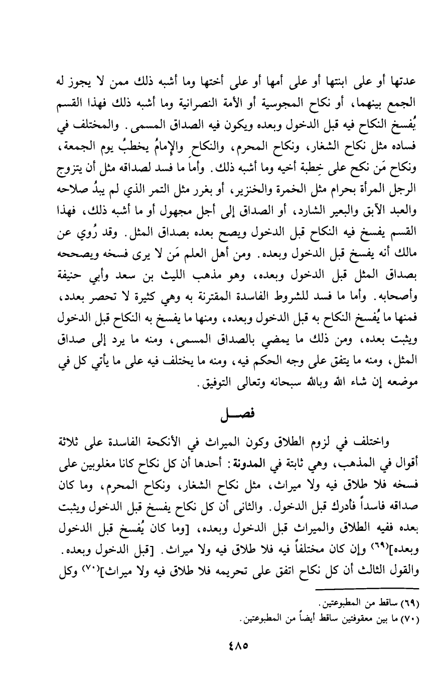 عدتها أو على ابنتها أو على أمها أو على أختها وما أشبه ذلك ممن لا يجوز له الجمع بينهما، أو نكاح المجوسية أو الأمة النصرانية وما أشبه ذلك فهذا القسم يفسخ النكاح فيه قبل الدخول وبعده ويكون فيه الصداق المسمى. والمختلف في فساده مثل نكاح الشغار، ونكاح المحرم، والنكاح والإمام يخطب يوم الجمعة، ونكاح من نكح على خطبة أخيه وما أشبه ذلك. وأما ما فسد لصداقه مثل أن يتزوج الرجل المرأة بحرام مثل الخمرة والخنزير، أو بغرر مثل التمر الذي لم يبد صلاحه والعبد الآبق والبعير الشارد، أو الصداق إلى أجل مجهول أو ما أشبه ذلك، فهذا القسم يفسخ فيه النكاح قبل الدخول ويصح بعده بصداق المثل. وقد روي عن مالك أنه يفسخ قبل الدخول وبعده. ومن أهل العلم من لا يرى فسخه ويصححه بصداق المثل قبل الدخول وبعده، وهو مذهب الليث بن سعد وأبي حنيفة وأصحابه. وأما ما فسد للشروط الفاسدة المقترنة به وهي كثيرة لا تحصر بعدد، فمنها ما يفسخ النكاح به قبل الدخول وبعده، ومنها ما يفسخ به النكاح قبل الدخول ويثبت بعده، ومن ذلك ما يمضي بالصداق المسمى، ومنه ما يرد إلى صداق المثل، ومنه ما يتفق على وجه الحكم فيه، ومنه ما يختلف فيه على ما يأتي كل في موضعه إن شاء الله وبالله سبحانه وتعالى التوفيق.