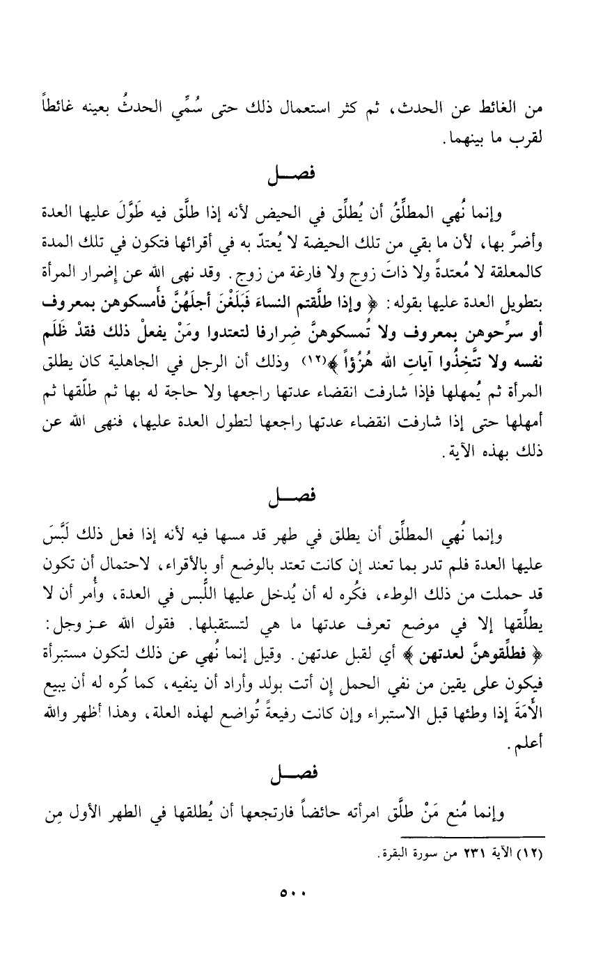 وإنما نهي المطلق أن يطلق في الحيض؛ لأنه إذا طلق فيه طول عليها العدة وأضر بها؛ لأن ما بقي من تلك الحيضة لا يعتد به في أقرائها فتكون في تلك المدة كالمعلقة لا معتدة ولا ذات زوج ولا فارغة من زوج. وقد نهى الله عن إضرار المرأة بتطويل العدة عليها بقوله: {وَإِذَا طَلَّقْتُمُ النِّسَاءَ فَبَلَغْنَ أَجَلَهُنَّ فَأَمْسِكُوهُنَّ بِمَعْرُوفٍ أَوْ سَرِّحُوهُنَّ بِمَعْرُوفٍ وَلا تُمْسِكُوهُنَّ ضِرَارًا لِتَعْتَدُوا وَمَنْ يَفْعَلْ ذَلِكَ فَقَدْ ظَلَمَ نَفْسَهُ وَلا تَتَّخِذُوا آيَاتِ اللَّهِ هُزُوًا} [البقرة: 231] وذلك أن الرجل في الجاهلية كان يطلق المرأة ثم يمهلها فإذا شارفت انقضاء عدتها راجعها ولا حاجة له بها ثم طلقها ثم أمهلها حتى إذا شارفت انقضاء عدتها راجعها لتطول العدة عليها، فنهى الله عن ذلك بهذه الآية.