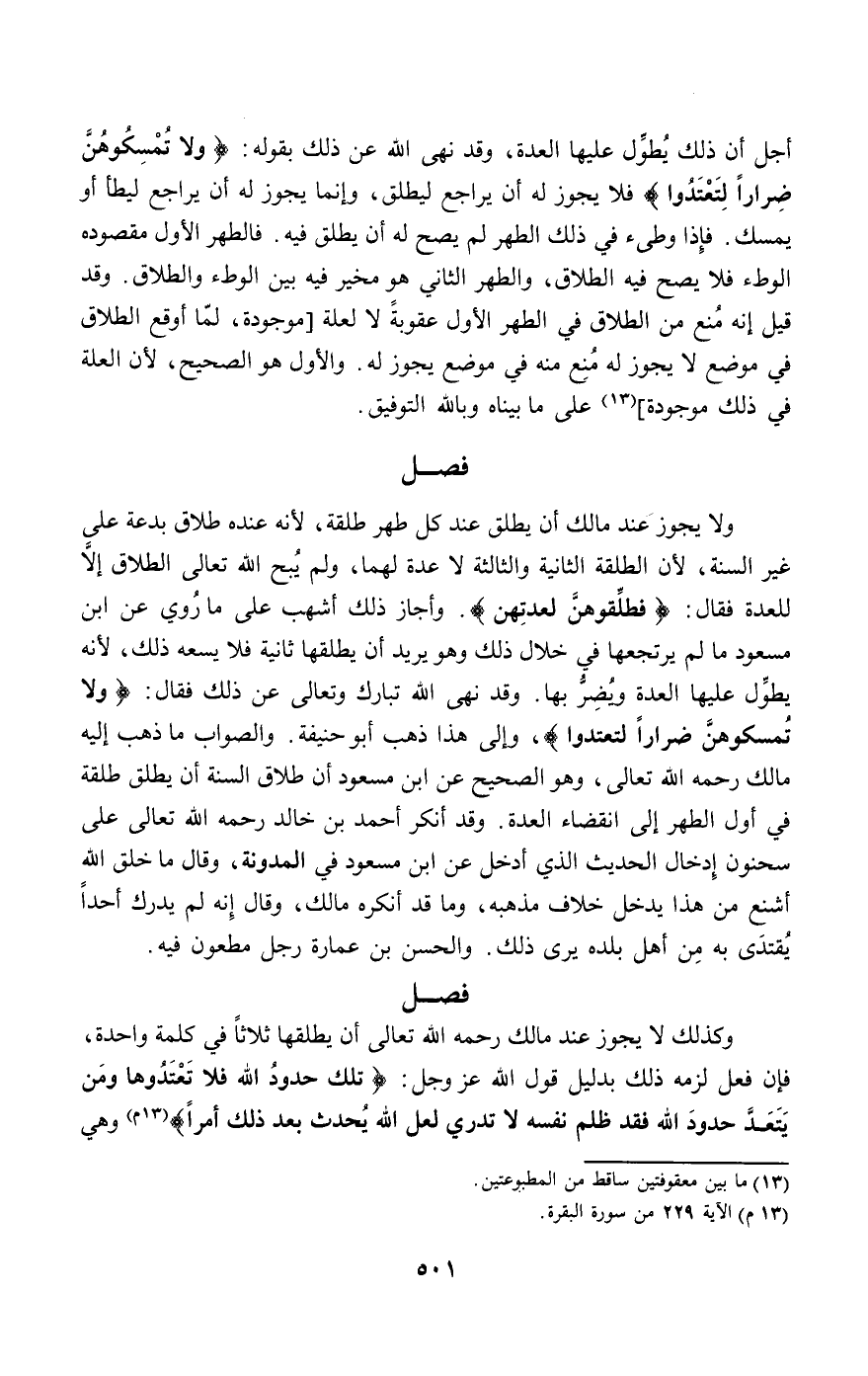ولا يجوز عند مالك أن يطلق عند كل طهر طلقة؛ لأنه عنده طلاق بدعة على غير السنة؛ لأن الطلقة الثانية والثالثة لا عدة لهما، ولم يبح الله تعالى الطلاق إلا للعدة فقال: {فَطَلِّقُوهُنَّ لِعِدَّتِهِنَّ} [الطلاق: 1]. وأجاز ذلك أشهب على ما روي عن ابن مسعود ما لم يرتجعها في خلال ذلك وهو يريد أن يطلقها ثانية فلا يسعه ذلك؛ لأنه يطول عليها العدة ويضر بها. وقد نهى الله تبارك وتعالى عن ذلك فقال: {وَلا تُمْسِكُوهُنَّ ضِرَارًا لِتَعْتَدُوا} [البقرة: 231]، وإلى هذا ذهب أبو حنيفة. والصواب ما ذهب إليه مالك - رَحِمَهُ اللَّهُ تَعَالَى -، وهو الصحيح عن ابن مسعود أن طلاق السنة أن يطلق طلقة في أول الطهر إلى انقضاء العدة. وقد أنكر أحمد بن خالد - رَحِمَهُ اللَّهُ تَعَالَى - على سحنون إدخال الحديث الذي أدخل عن ابن مسعود في المدونة، وقال: ما خلق الله أشنع من هذا يدخل خلاف مذهبه، وما قد أنكره مالك، وقال: إنه لم يدرك أحدا يقتدى به من أهل بلده يرى ذلك. والحسن بن عمارة رجل مطعون فيه.