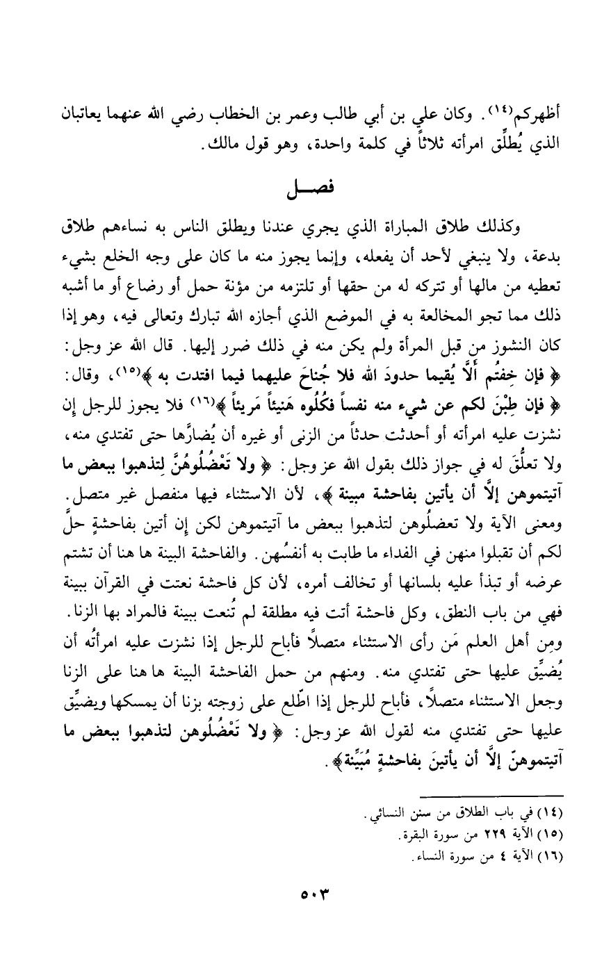 أظهركم». وكان علي بن أبي طالب وعمر بن الخطاب - رَضِيَ اللَّهُ عَنْهُمَا - يعاتبان الذي يطلق امرأته ثلاثا في كلمة واحدة، وهو قول مالك.