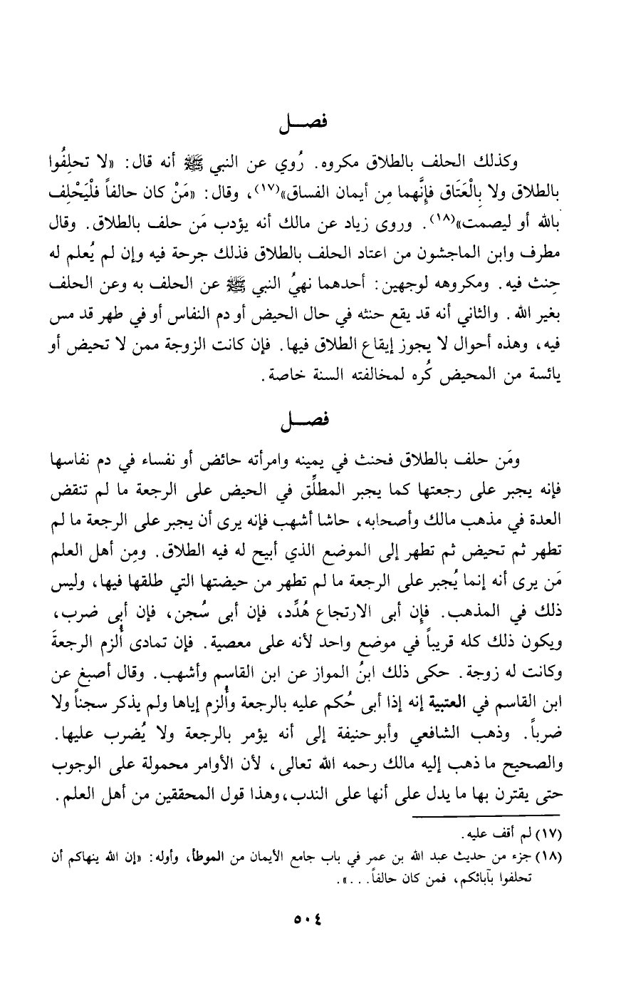 وكذلك الحلف بالطلاق مكروه. روي عن النبي - صَلَّى اللَّهُ عَلَيْهِ وَسَلَّمَ - أنه قال: «لا تحلفوا بالطلاق ولا بالعتاق فإنهما من أيمان الفساق»، وقال: «من كان حالفا فليحلف بالله أو ليصمت». وروى زياد عن مالك أنه يؤدب من حلف بالطلاق. وقال مطرف وابن الماجشون: من اعتاد الحلف بالطلاق فذلك جرحة فيه وإن لم يعلم له حنث فيه. ومكروهه لوجهين: أحدهما: نهي النبي - صَلَّى اللَّهُ عَلَيْهِ وَسَلَّمَ - عن الحلف به وعن الحلف بغير الله. والثاني: أنه قد يقع حنثه في حال الحيض أو دم النفاس أو في طهر قد مس فيه، وهذه أحوال لا يجوز إيقاع الطلاق فيها. فإن كانت الزوجة ممن لا تحيض أو يائسة من المحيض كره لمخالفته السنة خاصة.