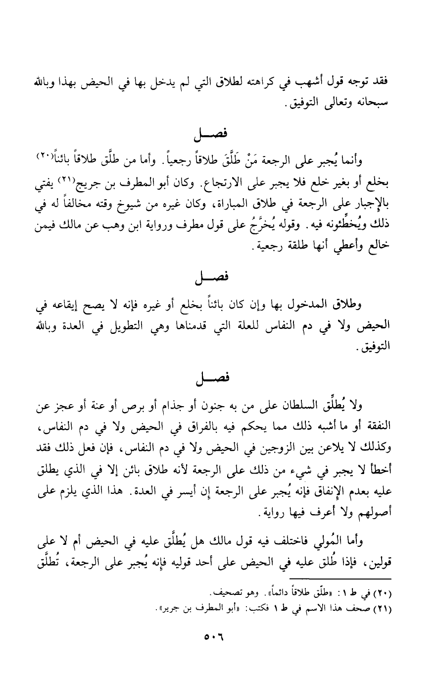 ولا يطلق السلطان على من به جنون أو جذام أو برص أو عنة أو عجز عن النفقة أو ما أشبه ذلك مما يحكم فيه بالفراق في الحيض ولا في دم النفاس، وكذلك لا يلاعن بين الزوجين في الحيض ولا في دم النفاس، فإن فعل ذلك فقد أخطأ لا يجبر في شيء من ذلك على الرجعة؛ لأنه طلاق بائن إلا في الذي يطلق عليه بعدم الإنفاق فإنه يجبر على الرجعة إن أيسر في العدة. هذا الذي يلزم على أصولهم ولا أعرف فيها رواية.