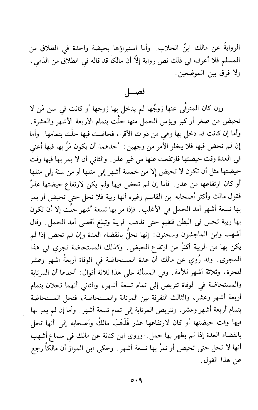وإن كان المتوفى عنها زوجها لم يدخل بها زوجها أو كانت في سن من لا تحيض من صغر أو كبر ويؤمن الحمل منها حلت بتمام الأربعة الأشهر والعشرة. وأما إن كانت قد دخل بها وهي من ذوات الأقراء فحاضت فيها حلت بتمامها. وأما إن لم تحض فيها فلا يخلو الأمر من وجهين: أحدهما: أن يكون مر بها فيها - أعني في العدة - وقت حيضتها فارتفعت عنها من غير عذر. والثاني: أن لا يمر بها فيها وقت حيضتها مثل أن تكون لا تحيض إلا من خمسة أشهر إلى مثلها أو من سنة إلى مثلها أو كان ارتفاعها من عذر. فأما إن لم تحض فيها ولم يكن لارتفاع حيضتها عذر فقول مالك وأكثر أصحابه ابن القاسم وغيره: إنها ريبة فلا تحل حتى تحيض أو يمر بها تسعة أشهر أمد الحمل في الأغلب. فإذا مر بها تسعة أشهر حلت إلا أن تكون بها ريبة تحس في البطن فتقيم حتى تذهب الريبة وتبلغ أقصى أمد الحمل. وقال أشهب وابن الماجشون وسحنون: إنها تحل بانقضاء العدة وإن لم تحض إذا لم يكن بها من الريبة أكثر من ارتفاع الحيض. وكذلك المستحاضة تجري في هذا المجرى. وقد روي عن مالك أن عدة المستحاضة في الوفاة أربعة أشهر وعشر للحرة، وثلاثة أشهر للأمة. وفي المسألة على هذا ثلاثة أقوال: أحدها: أن المرتابة والمستحاضة في الوفاة تتربص إلى تمام تسعة أشهر، والثاني: أنهما تحلان بتمام أربعة أشهر وعشر، والثالث: التفرقة بين المرتابة والمستحاضة، فتحل المستحاضة بتمام أربعة أشهر وعشر، وتتربص المرتابة إلى تمام تسعة أشهر. وأما إن لم يمر بها فيها وقت حيضتها أو كان لارتفاعها عذر فذهب مالك وأصحابه إلى أنها تحل بانقضاء العدة إذا لم يظهر بها حمل. وروى ابن كنانة عن مالك في سماع أشهب أنها لا تحل حتى تحيض أو تمر بها تسعة أشهر. وحكى ابن المواز أن مالكا رجع عن هذا القول.
