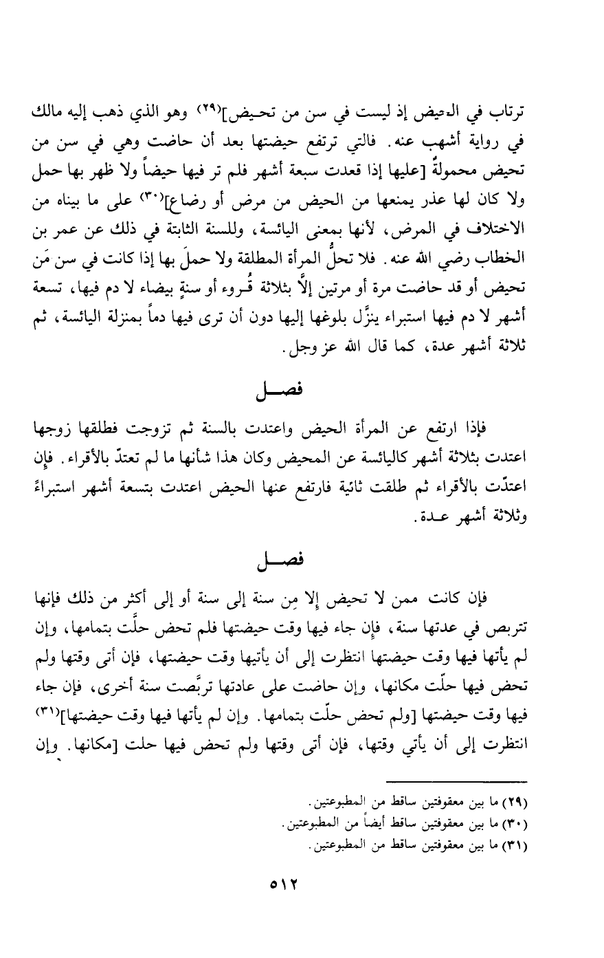 ترتاب في الحيض إذ ليست في سن من تحيض، وهو الذي ذهب إليه مالك في رواية أشهب عنه. فالتي ترتفع حيضتها بعد أن حاضت وهي في سن من تحيض محمولة [عليها إذا قعدت سبعة أشهر فلم تر فيها حيضا ولا ظهر بها حمل ولا كان لها عذر يمنعها من الحيض من مرض أو رضاع] على ما بيناه من الاختلاف في المرض؛ لأنها بمعنى اليائسة، وللسنة الثابتة في ذلك عن عمر بن الخطاب - رَضِيَ اللَّهُ عَنْهُ -. فلا تحل المرأة المطلقة ولا حمل بها إذا كانت في سن من تحيض أو قد حاضت مرة أو مرتين إلا بثلاثة قروء أو سنة بيضاء لا دم فيها، تسعة أشهر لا دم فيها استبراء ينزل بلوغها إليها دون أن ترى فيها دما بمنزلة اليائسة، ثم ثلاثة أشهر عدة، كما قال الله عز وجل.