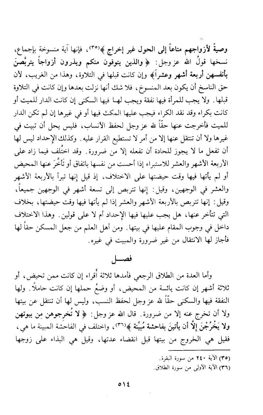 ، فإنها آية منسوخة بإجماع، نسخها قول الله عز وجل: {وَالَّذِينَ يُتَوَفَّوْنَ مِنْكُمْ وَيَذَرُونَ أَزْوَاجًا يَتَرَبَّصْنَ بِأَنْفُسِهِنَّ أَرْبَعَةَ أَشْهُرٍ وَعَشْرًا} [البقرة: 234]، وإن كانت قبلها في التلاوة، وهذا من الغريب؛ لأن حق الناسخ أن يكون بعد المنسوخ، فلا شك أنها نزلت بعدها، وإن كانت في التلاوة قبلها. ولا يجب للمرأة فيها نفقة ويجب لها فيها السكنى إن كانت الدار للميت أو كانت بكراء، وقد نقد الكراء فيجب عليها المكث فيها أو في غيرها إن لم تكن الدار للميت فأخرجت عنها حقا لله عز وجل لحفظ الأنساب، فليس يحل أن تبيت في غيرها ولا أن تنتقل عنها إلا من أمر لا تستطيع القرار عليه. وكذلك الإحداد ليس لها أن تفعل ما لا يجوز للحادة أن تفعله إلا من ضرورة. وقد اختلف فيما زاد على الأربعة الأشهر والعشر للاستبراء إذا أحست من نفسها باتفاق أو تأخر عنها المحيض أو لم يأتها فيها وقت حيضتها على الاختلاف؛ إذ قيل: إنها تبرأ بالأربعة الأشهر والعشر في الوجهين، وقيل: إنها تتربص إلى تسعة أشهر في الوجهين جميعا، وقيل: إنها تتربص بالأربعة الأشهر والعشر إذا لم يأتها فيها وقت حيضتها، بخلاف التي تتأخر عنها، هل يجب عليها فيها الإحداد أم لا على قولين. وهذا الاختلاف داخل في وجوب المقام عليها في بيتها. ومن أهل العلم من جعل المسكن حقا لها فأجاز لها الانتقال من غير ضرورة والمبيت في غيره.