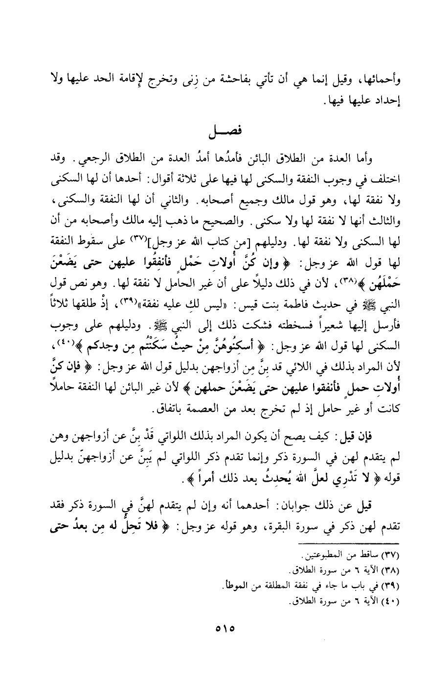 وأما العدة من الطلاق البائن فأمدها أمد العدة من الطلاق الرجعي. وقد اختلف في وجوب النفقة والسكنى لها فيها على ثلاثة أقوال: أحدها: أن لها السكنى ولا نفقة لها، وهو قول مالك وجميع أصحابه. والثاني: أن لها النفقة والسكنى، والثالث: أنها لا نفقة لها ولا سكنى. والصحيح ما ذهب إليه مالك وأصحابه من أن لها السكنى ولا نفقة لها. ودليلهم [من كتاب الله عز وجل] على سقوط النفقة لها قول الله عز وجل: {وَإِنْ كُنَّ أُولاتِ حَمْلٍ فَأَنْفِقُوا عَلَيْهِنَّ حَتَّى يَضَعْنَ حَمْلَهُنَّ} [الطلاق: 6]، لأن في ذلك دليلا على أن غير الحامل لا نفقة لها. وهو نص «قول النبي - صَلَّى اللَّهُ عَلَيْهِ وَسَلَّمَ - في حديث فاطمة بنت قيس: " ليس لك عليه نفقة "؛ إذ طلقها ثلاثا فأرسل إليها شعيرا فسخطته فشكت ذلك إلى النبي - صَلَّى اللَّهُ عَلَيْهِ وَسَلَّمَ -». ودليلهم على وجوب السكنى لها قول الله عز وجل: {أَسْكِنُوهُنَّ مِنْ حَيْثُ سَكَنْتُمْ مِنْ وُجْدِكُمْ} [الطلاق: 6]، لأن المراد بذلك في اللائي قد بن من أزواجهن بدليل قول الله عز وجل: {وَإِنْ كُنَّ أُولاتِ حَمْلٍ فَأَنْفِقُوا عَلَيْهِنَّ حَتَّى يَضَعْنَ حَمْلَهُنَّ} [الطلاق: 6] لأن غير البائن لها النفقة حاملا كانت أو غير حامل؛ إذ لم تخرج بعد من العصمة باتفاق.