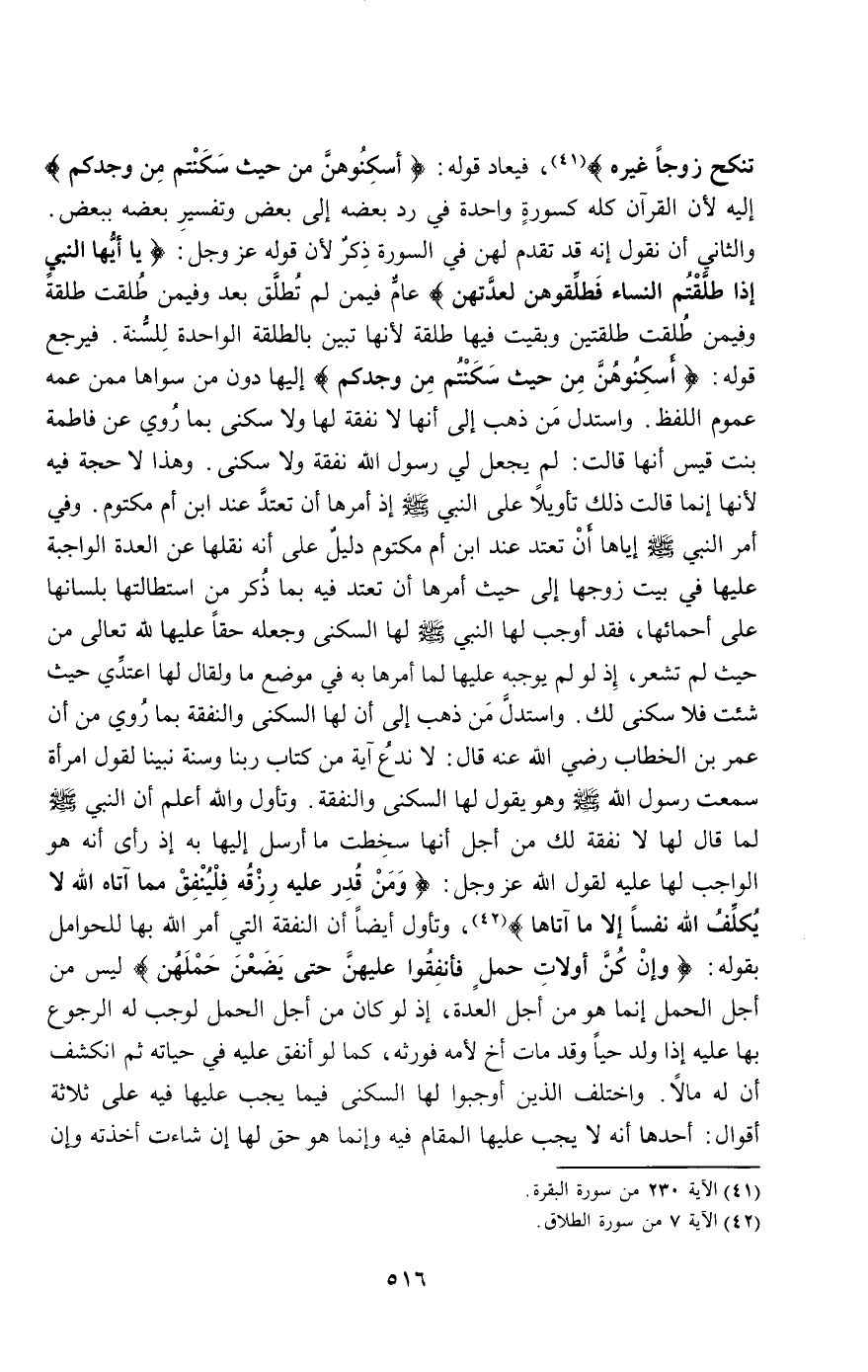 فيعاد قوله: {أَسْكِنُوهُنَّ مِنْ حَيْثُ سَكَنْتُمْ مِنْ وُجْدِكُمْ} [الطلاق: 6] إليه؛ لأن القرآن كله كسورة واحدة في رد بعضه إلى بعض وتفسير بعضه ببعض. والثاني: أن نقول: إنه قد تقدم لهن في السورة ذكر؛ لأن قوله عز وجل: {يَا أَيُّهَا النَّبِيُّ إِذَا طَلَّقْتُمُ النِّسَاءَ فَطَلِّقُوهُنَّ لِعِدَّتِهِنَّ} [الطلاق: 1] عام فيمن لم تطلق بعد، وفيمن طلقت طلقة، وفيمن طلقت طلقتين وبقيت فيها طلقة؛ لأنها تبين بالطلقة الواحدة للسنة. فيرجع قوله: {أَسْكِنُوهُنَّ مِنْ حَيْثُ سَكَنْتُمْ مِنْ وُجْدِكُمْ} [الطلاق: 6] إليها دون من سواها ممن عمه عموم اللفظ. واستدل من ذهب إلى أنها لا نفقة لها ولا سكنى، بما روي «عن فاطمة بنت قيس أنها قالت: لم يجعل لي رسول الله نفقة ولا سكنى». وهذا لا حجة فيه؛ لأنها إنما قالت ذلك تأويلا على النبي - صَلَّى اللَّهُ عَلَيْهِ وَسَلَّمَ - إذ أمرها أن تعتد عند ابن أم مكتوم. وفي أمر النبي - صَلَّى اللَّهُ عَلَيْهِ وَسَلَّمَ - إياها أن تعتد عند ابن أم مكتوم دليل على أنه نقلها عن العدة الواجبة عليها في بيت زوجها إلى حيث أمرها أن تعتد فيه بما ذكر من استطالتها بلسانها على أحمائها، فقد أوجب لها النبي - صَلَّى اللَّهُ عَلَيْهِ وَسَلَّمَ - لها السكنى وجعله حقا عليها لله تعالى من حيث لم تشعر؛ إذ لو لم يوجبه عليها لما أمرها به في موضع ما ولقال لها: اعتدي حيث شئت، فلا سكنى لك. واستدل من ذهب إلى أن لها السكنى والنفقة بما روي من أن عمر بن الخطاب - رَضِيَ اللَّهُ عَنْهُ - قال: لا ندع آية من كتاب ربنا وسنة نبينا لقول امرأة سمعت رسول الله - صَلَّى اللَّهُ عَلَيْهِ وَسَلَّمَ - وهو يقول: لها السكنى والنفقة. وتأول والله أعلم أن النبي - صَلَّى اللَّهُ عَلَيْهِ وَسَلَّمَ - لما قال لها: لا نفقة لك من أجل أنها سخطت ما أرسل إليها به؛ إذ رأى أنه هو الواجب لها عليه لقول الله عز وجل: {وَمَنْ قُدِرَ عَلَيْهِ رِزْقُهُ فَلْيُنْفِقْ مِمَّا آتَاهُ اللَّهُ لا يُكَلِّفُ اللَّهُ نَفْسًا إِلا مَا آتَاهَا} [الطلاق: 7]، وتأول أيضا أن النفقة التي أمر الله بها للحوامل بقوله: {وَإِنْ كُنَّ أُولاتِ حَمْلٍ فَأَنْفِقُوا عَلَيْهِنَّ حَتَّى يَضَعْنَ حَمْلَهُنَّ} [الطلاق: 6] ليس من أجل الحمل إنما هو من أجل العدة؛ إذ لو كان من أجل الحمل لوجب له الرجوع بها عليه إذا ولد حيا وقد مات أخ لأمه فورثه، كما لو أنفق عليه في حياته ثم انكشف أن له مالا. واختلف الذين أوجبوا لها السكنى فيما يجب عليها فيه على ثلاثة أقوال: أحدها: أنه لا يجب عليها المقام فيه، وإنما هو حق لها إن شاءت أخذته وإن