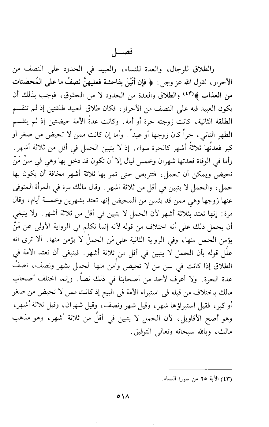 أو الطلاق للرجال، والعدة للنساء، والعبيد في الحدود على النصف من الأحرار؛ لقول الله عز وجل: {فَإِنْ أَتَيْنَ بِفَاحِشَةٍ فَعَلَيْهِنَّ نِصْفُ مَا عَلَى الْمُحْصَنَاتِ مِنَ الْعَذَابِ} [النساء: 25]، والطلاق والعدة من الحدود لا من الحقوق، فوجب بذلك أن يكون العبيد فيه على النصف من الأحرار، فكان طلاق العبيد طلقتين؛ إذ لم تنقسم الطلقة الثانية، كانت زوجته حرة أو أمة. وكانت عدة الأمة حيضتين إذ لم ينقسم الطهر الثاني، حرا كان زوجها أو عبدا. وأما إن كانت ممن لا تحيض من صغر أو كبر فعدتها ثلاثة أشهر كالحرة سواء؛ إذ لا يتبين الحمل في أقل من ثلاثة أشهر.