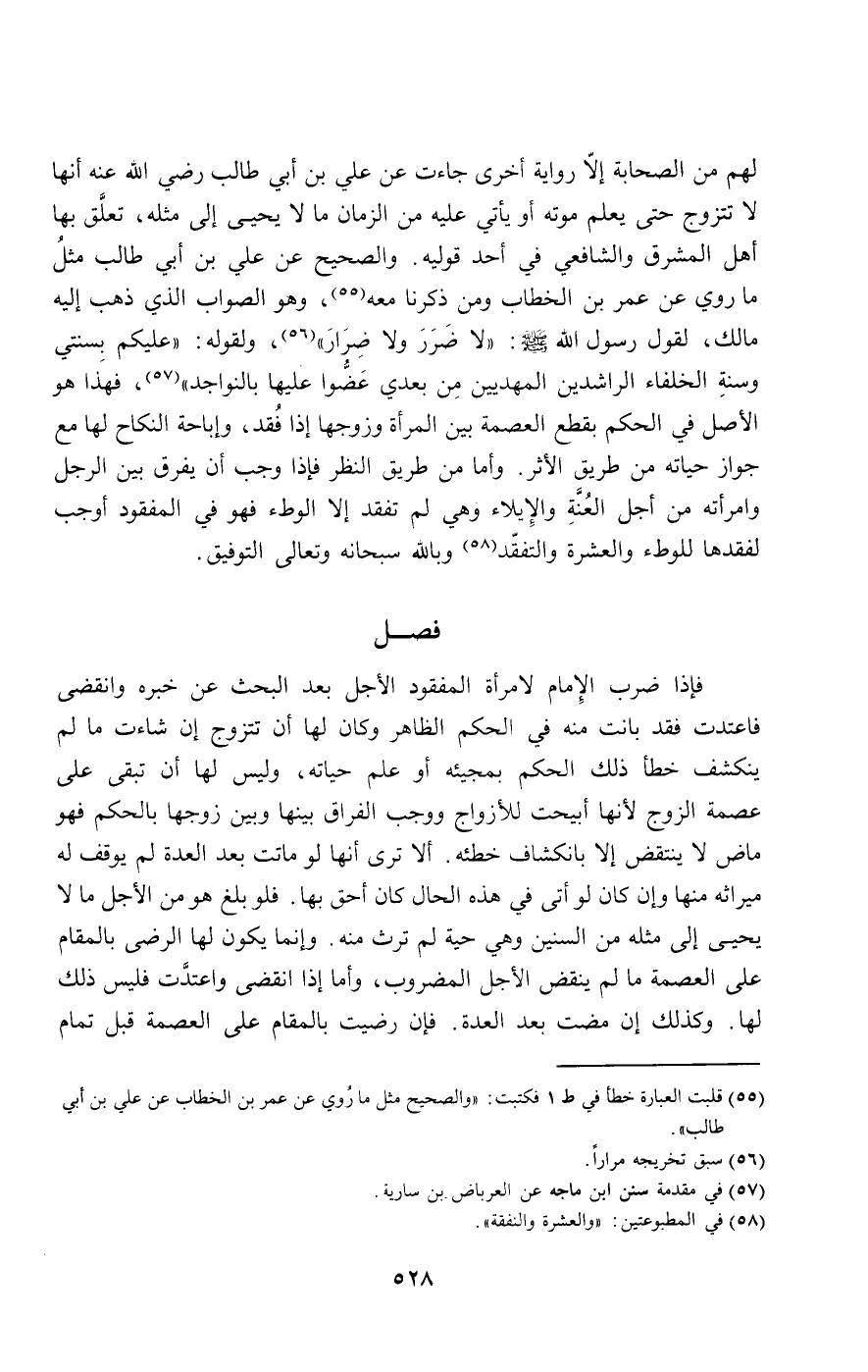 لهم من الصحابة إلا رواية أخرى جاءت عن علي بن أبي طالب - رَضِيَ اللَّهُ عَنْهُ - أنها لا تتزوج حتى يعلم موته أو يأتي عليه من الزمان ما لا يحيا إلى مثله، تعلق بها أهل المشرق والشافعي في أحد قوليه. والصحيح عن علي بن أبي طالب مثل ما روي عن عمر بن الخطاب ومن ذكرنا معه، وهو الصواب الذي ذهب إليه مالك، لقول رسول الله - صَلَّى اللَّهُ عَلَيْهِ وَسَلَّمَ -: «لا ضرر ولا ضرار»، ولقوله: «عليكم بسنتي وسنة الخلفاء الراشدين المهديين من بعدي، عضوا عليها بالنواجذ»، فهذا هو الأصل في الحكم بقطع العصمة بين المرأة وزوجها إذا فقد، وإباحة النكاح لها مع جواز حياته من طريق الأثر. وأما من طريق النظر فإذا وجب أن يفرق بين الرجل وامرأته من أجل العنة والإيلاء، وهي لم تفقد إلا الوطء فهو في المفقود أوجب لفقدها للوطء والعشرة والتفقد، وبالله سبحانه وتعالى التوفيق.