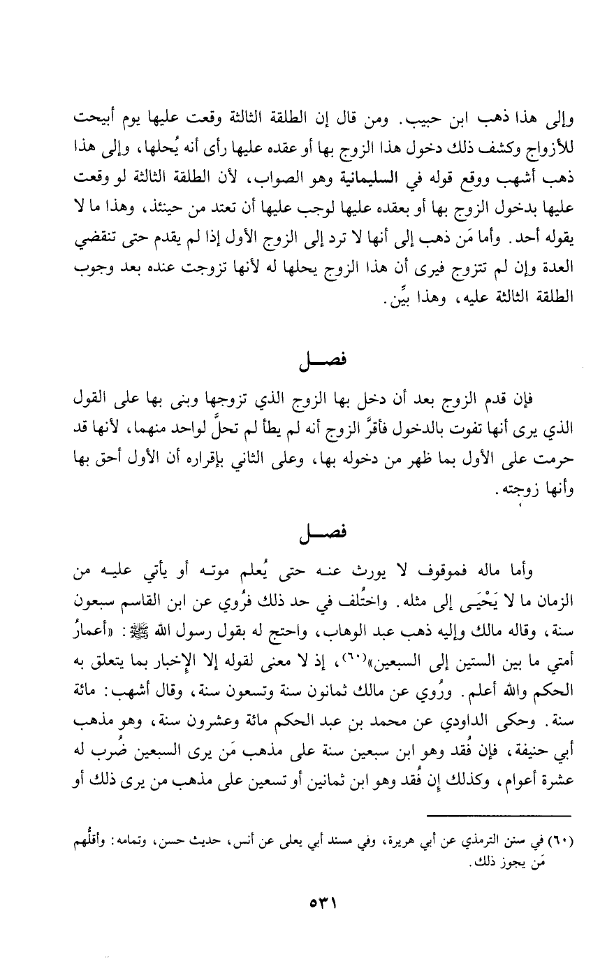 وأما ماله فموقوف لا يورث عنه حتى يعلم موته أو يأتي عليه من الزمان ما لا يحيا إلى مثله. واختلف في حد ذلك فروي عن ابن القاسم سبعون سنة، وقاله مالك وإليه ذهب عبد الوهاب، واحتج له بقول رسول الله - صَلَّى اللَّهُ عَلَيْهِ وَسَلَّمَ -: «أعمار أمتي ما بين الستين إلى السبعين»؛ إذ لا معنى لقوله إلا الإخبار بما يتعلق به الحكم، والله أعلم.