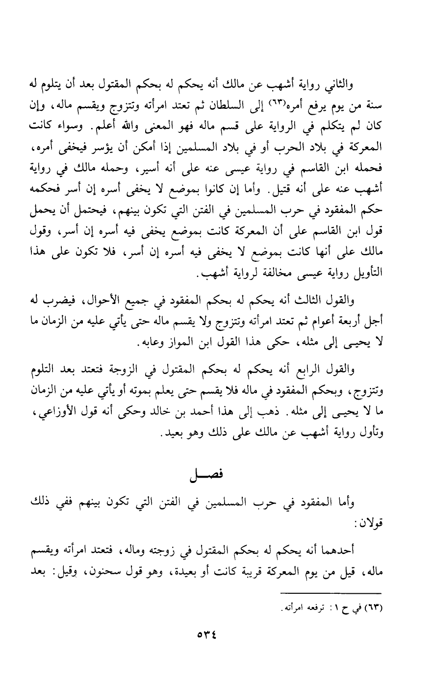 والثاني رواية أشهب عن مالك أنه يحكم له بحكم المقتول بعد أن يتلوم له سنة من يوم يرفع أمره إلى السلطان ثم تعتد امرأته وتتزوج ويقسم ماله، وإن كان لم يتكلم في الرواية على قسم ماله فهو المعنى والله أعلم. وسواء كانت المعركة في بلاد الحرب أو في بلاد المسلمين إذا أمكن أن يؤسر فيخفى أمره، فحمله ابن القاسم في رواية عيسى عنه على أنه أسير، وحمله مالك في رواية أشهب عنه على أنه قتيل. وأما إن كانوا بموضع لا يخفى أسره إن أسر فحكمه حكم المفقود في حرب المسلمين في الفتن التي تكون بينهم، فيحتمل أن يحمل قول ابن القاسم على أن المعركة كانت بموضع يخفى فيه أسره إن أسر، وقول مالك على أنها كانت بموضع لا يخفى فيه أسره إن أسر، فلا تكون على هذا التأويل رواية عيسى مخالفة لرواية أشهب.