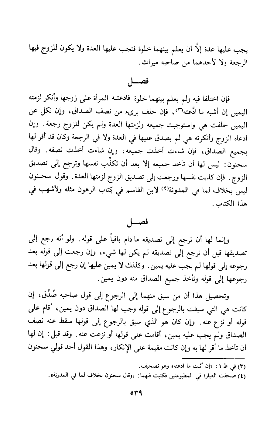 فإن اختلفا فيه ولم يعلم بينهما خلوة فادعته المرأة على زوجها وأنكر لزمته اليمين إن أشبه ما ادعته، فإن حلف برئ من نصف الصداق، وإن نكل عن اليمين حلفت هي واستوجبت جميعه ولزمتها العدة ولم يكن للزوج رجعة. وإن ادعاه الزوج وأنكرته هي لم يصدق عليها في العدة ولا في الرجعة وكان قد أقر لها بجميع الصداق، فإن شاءت أخذت جميعه، وإن شاءت أخذت نصفه. وقال سحنون: ليس لها أن تأخذ جميعه إلا بعد أن تكذب نفسها وترجع إلى تصديق الزوج. فإن كذبت نفسها ورجعت إلى تصديق الزوج لزمتها العدة. وقول سحنون ليس بخلاف لما في المدونة لابن القاسم في كتاب الرهون مثله ولأشهب في هذا الكتاب.