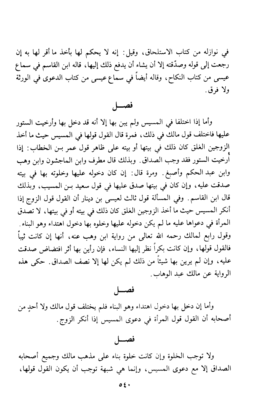 ولا توجب الخلوة وإن كانت خلوة بناء على مذهب مالك وجميع أصحابه الصداق إلا مع دعوى المسيس، وإنما هي شبهة توجب أن يكون القول قولها،