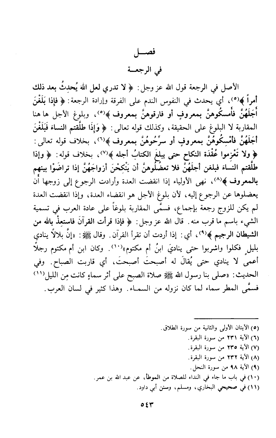الأصل في الرجعة قول الله عز وجل: {لا تَدْرِي لَعَلَّ اللَّهَ يُحْدِثُ بَعْدَ ذَلِكَ أَمْرًا} [الطلاق: 1]، أي يحدث في النفوس الندم على الفرقة وإرادة الرجعة: {فَإِذَا بَلَغْنَ أَجَلَهُنَّ فَأَمْسِكُوهُنَّ بِمَعْرُوفٍ أَوْ فَارِقُوهُنَّ بِمَعْرُوفٍ} [الطلاق: 2]، وبلوغ الأجل هاهنا المقاربة لا البلوغ على الحقيقة، وكذلك قَوْله تَعَالَى: {وَإِذَا طَلَّقْتُمُ النِّسَاءَ فَبَلَغْنَ أَجَلَهُنَّ فَأَمْسِكُوهُنَّ بِمَعْرُوفٍ أَوْ سَرِّحُوهُنَّ بِمَعْرُوفٍ} [البقرة: 231]، بخلاف قَوْله تَعَالَى: {وَلا تَعْزِمُوا عُقْدَةَ النِّكَاحِ حَتَّى يَبْلُغَ الْكِتَابُ أَجَلَهُ} [البقرة: 235]، بخلاف قوله: {وَإِذَا طَلَّقْتُمُ النِّسَاءَ فَبَلَغْنَ أَجَلَهُنَّ فَلا تَعْضُلُوهُنَّ أَنْ يَنْكِحْنَ أَزْوَاجَهُنَّ إِذَا تَرَاضَوْا بَيْنَهُمْ بِالْمَعْرُوفِ} [البقرة: 232]، نهى الأولياء إذا انقضت العدة وأرادت الرجوع إلى زوجها أن يعضلوها عن الرجوع إليه؛ لأن بلوغ الأجل هو انقضاء العدة، وإذا انقضت العدة لم يكن للزوج رجعة بإجماع، فسمى المقاربة بلوغا على عادة العرب في تسمية الشيء باسم ما قرب منه. قال الله عز وجل: {فَإِذَا قَرَأْتَ الْقُرْآنَ فَاسْتَعِذْ بِاللَّهِ مِنَ الشَّيْطَانِ الرَّجِيمِ} [النحل: 98]، أي: إذا أردت أن تقرأ القرآن. وقال - صَلَّى اللَّهُ عَلَيْهِ وَسَلَّمَ -: «إن بلالا ينادي بليل فكلوا واشربوا حتى ينادي ابن أم مكتوم». وكان ابن أم مكتوم رجلا أعمى لا ينادي حتى يقال له أصبحت أصبحت، أي قاربت الصباح. وفي الحديث: «صلى بنا رسول الله - صَلَّى اللَّهُ عَلَيْهِ وَسَلَّمَ - صلاة الصبح على أثر سماء كانت من الليل؛» فسمى المطر سماء لما كان نزوله من السماء. وهذا كثير في لسان العرب.